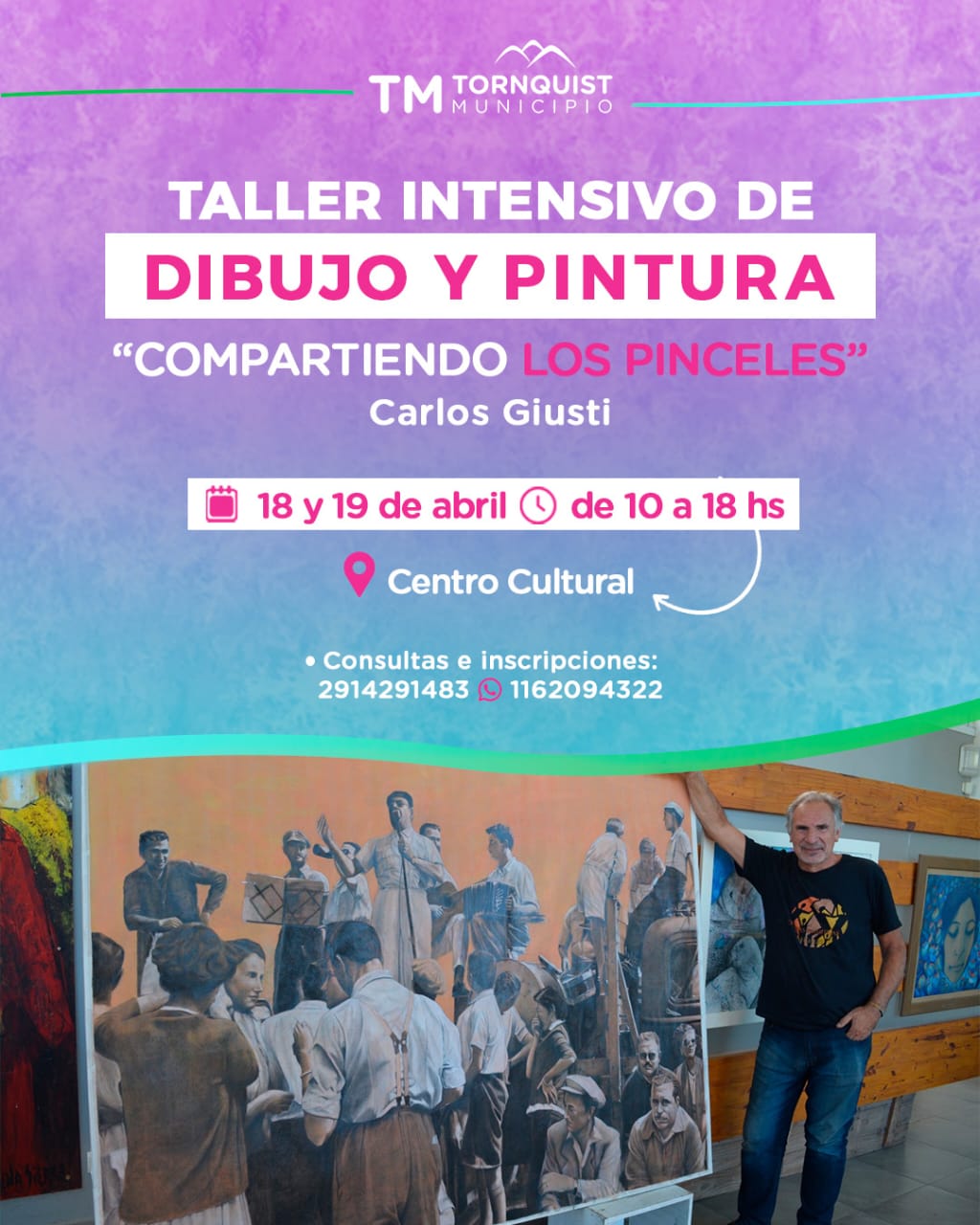 El reconocido artista celebra 23 años de encuentros en la comarca con un taller intensivo este 18 y 19 de abril. Sin requisitos de experiencia previa, la propuesta invita a los vecinos a «juntar las ganas de crear» y disfrutar del oficio en el Centro Cultural. Además, Giusti adelantó detalles de su próxima muestra en Los Toldos dedicada a la figura de Eva Perón.