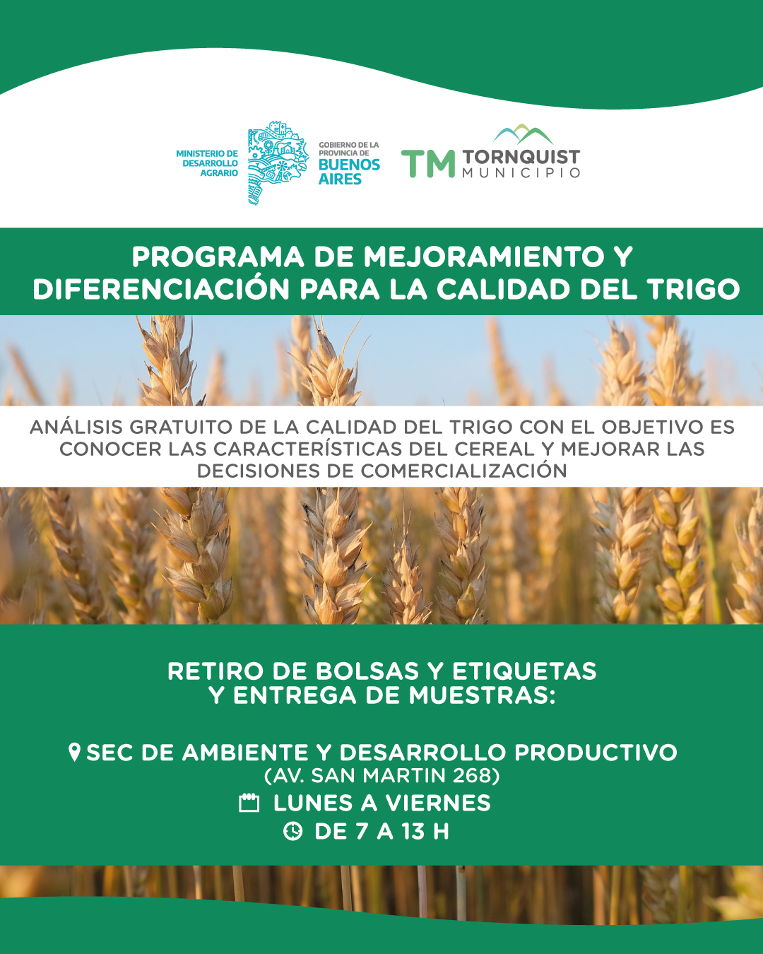 La Secretaría de Ambiente y Desarrollo Productivo de Tornquist Municipio, informa que se encuentra abierta la convocatoria al programa de mejoramiento y diferenciación para la calidad del trigo.