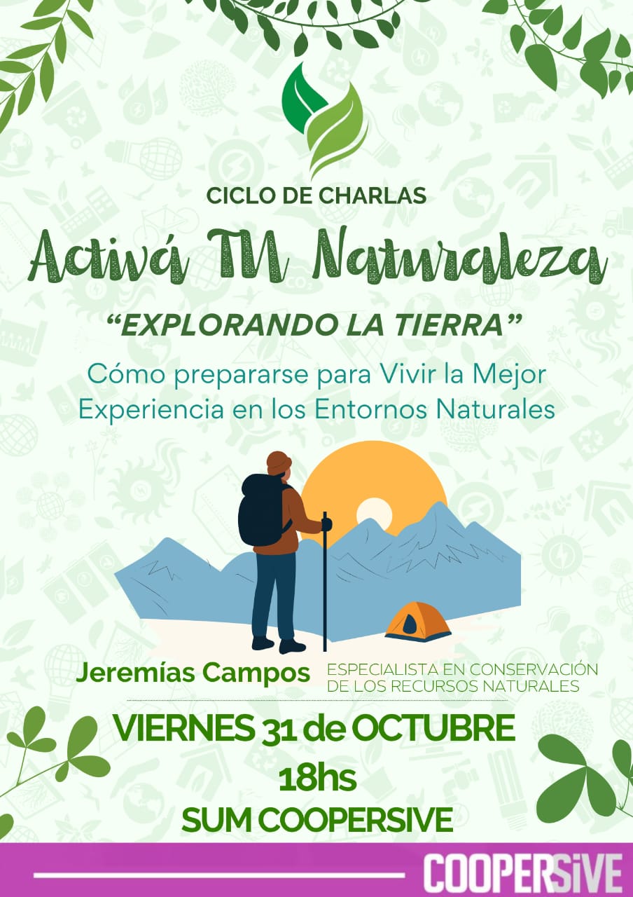 La charla será dictada por Jeremías Campos, quien es especialista en Conservación de los Recursos Naturales. El evento se realizará este viernes 31 de octubre a las 18:00 horas en el SUM COOPERSIVE. El encuentro está dirigido a quienes deseen mejorar sus conocimientos y preparación para disfrutar de manera segura y responsable de la naturaleza.