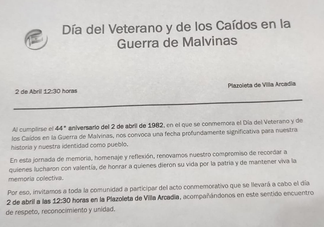 A 44 años de la gesta de 1982, se realizará un encuentro de reflexión y homenaje en la Plazoleta de Villa Arcadia para honrar la memoria de nuestros héroes.