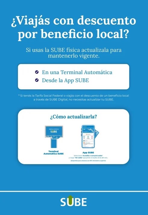 La solicitud responde a un requerimiento técnico a nivel nacional.El Gobierno del Chubut, a través del Ministerio de Gobierno, informa que SUBE puso en marcha un proceso de actualización técnica del sistema, que requiere que las personas usuarias que utilicen la tarjeta física y cuenten con descuentos locales realicen una validación para asegurar que los beneficios sigan activos al momento de viajar.