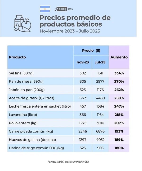 Un informe de Celag Data, con cifras del INDEC, revela que la sal, el pan, el jabón y el aceite lideran los aumentos. La leche subió un 247% en el GBA.El precio de una canasta de productos básicos de consumo masivo registró aumentos de hasta un 334% en el Gran Buenos Aires entre noviembre de 2023 y julio de 2025. El dato surge de un informe del Centro Estratégico Latinoamericano de Geopolítica (CELAG), elaborado en base a las cifras oficiales del INDEC.
