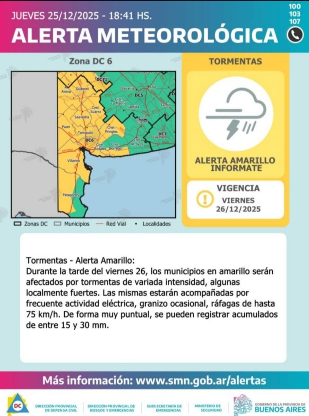 De acuerdo a los últimos datos y el reporte de Defensa Civil, este 26 de diciembre la región de Ventania enfrentará una jornada de altas temperaturas que alcanzarán los 34°C. Se esperan vientos intensos del sector Noroeste con ráfagas muy fuertes hacia la tarde, lo que eleva el riesgo de incendios y requiere extremar cuidados al aire libre.