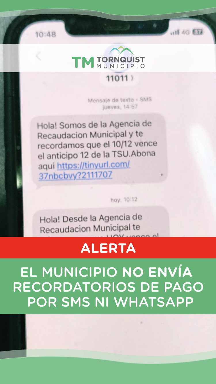Tornquist Municipio informa a la comunidad que, en las últimas horas, se han detectado mensajes de texto y WhatsApp enviados a vecinos en nombre del municipio, en los que se “recuerdan” supuestos vencimientos de pagos y se incluye un enlace para abonarlos.