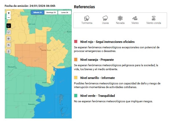 1. Provincia de La Pampa (Nivel Naranja): Gran parte del territorio pampeano se encuentra bajo alerta naranja. Esto implica la posibilidad de tormentas localmente fuertes o severas, que pueden estar acompañadas por ráfagas muy intensas, caída de granizo de diversos tamaños, fuerte actividad eléctrica y abundante caída de agua en cortos períodos.