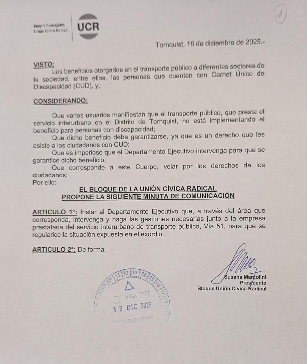 El Bloque de Concejales de la Unión Cívica Radical, presentó Minuta de Comunicación instando al Departamento Ejecutivo que,