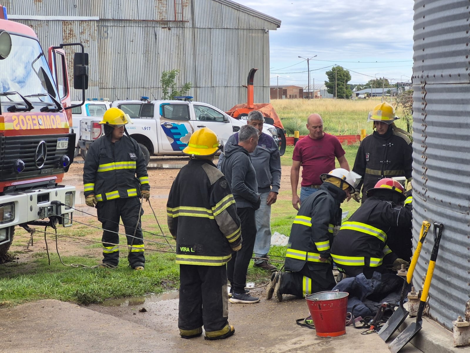 Los Bomberos Voluntarios de Tornquist acudieron a un llamado de emergencia para realizar el rescate de una persona en una planta de silos de la localidad, ubicada frente a la estación de trenes.