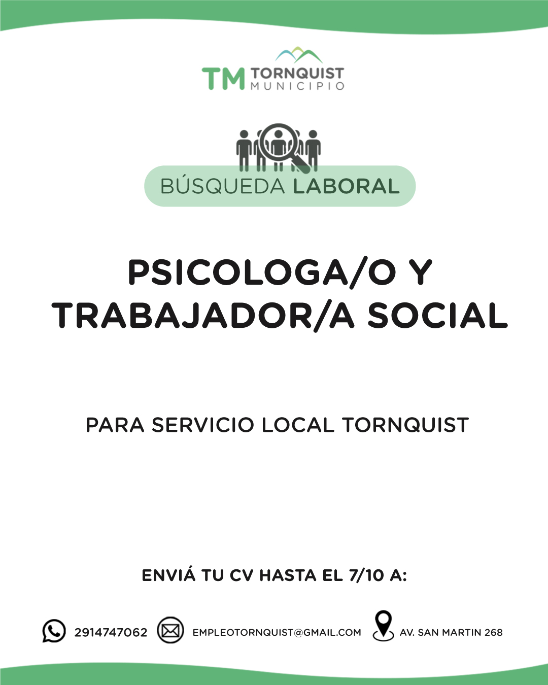 Los/as interesados/as deben enviar CV a la Oficina de Empleo hasta el martes 7 de Octubre, a empletornquist@gmail.com, por WhatsApp al 2914747062 o personalmente en Av. San Martín 268.