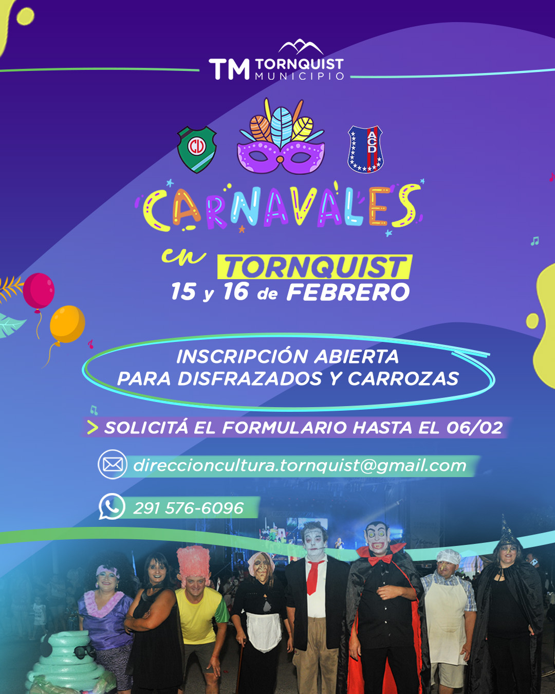 La Subsecretaría de Cultura informa que se encuentran abiertas las inscripciones para participar con disfrazados y carrozas en los Carnavales de Tornquist, que se llevarán a cabo los días 15 y 16 de febrero.