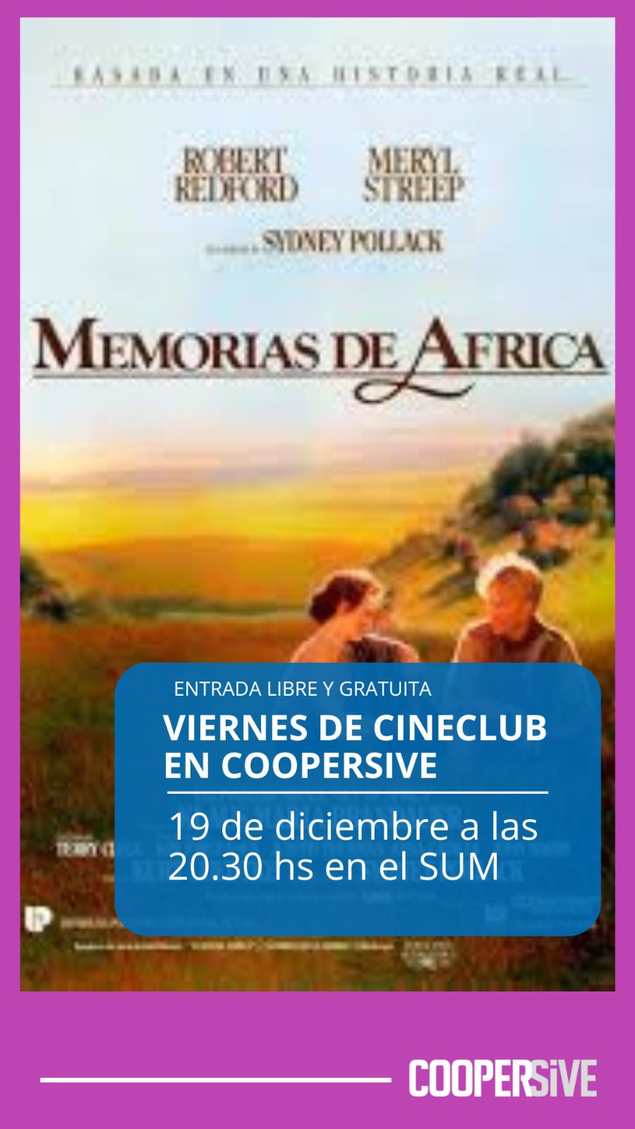 La cita será este viernes 19 de diciembre en el SUM de la cooperativa. La función invita a disfrutar de una de las historias de amor más icónicas del cine, protagonizada por Meryl Streep y Robert Redford.