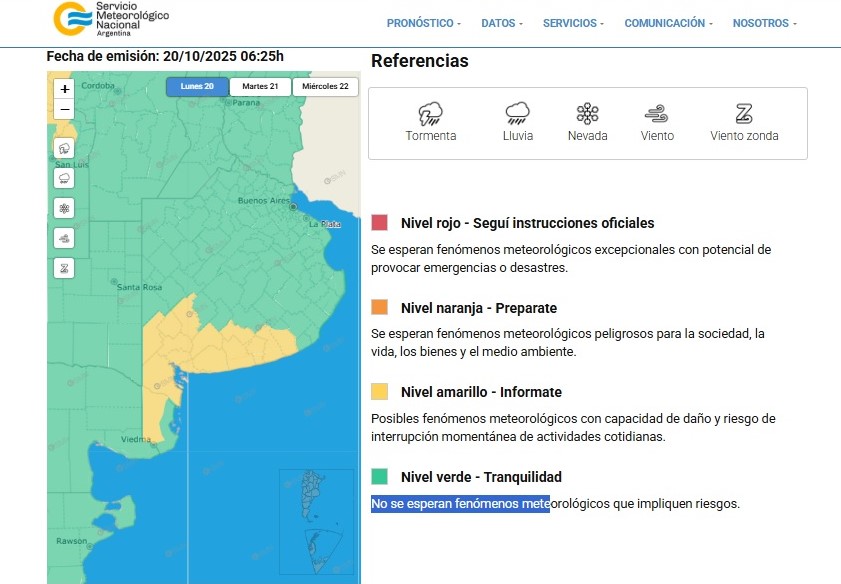 Para este lunes 20 la temperatura máxima podría llegar a los 24° y para mañana el SMN anticipa la probabilidad de tormentas durante todo el día, con vientos que rotarán al sector sureste promediando entre 20 y 30 km/h y con una temperatura máxima que rondaría los 25°.