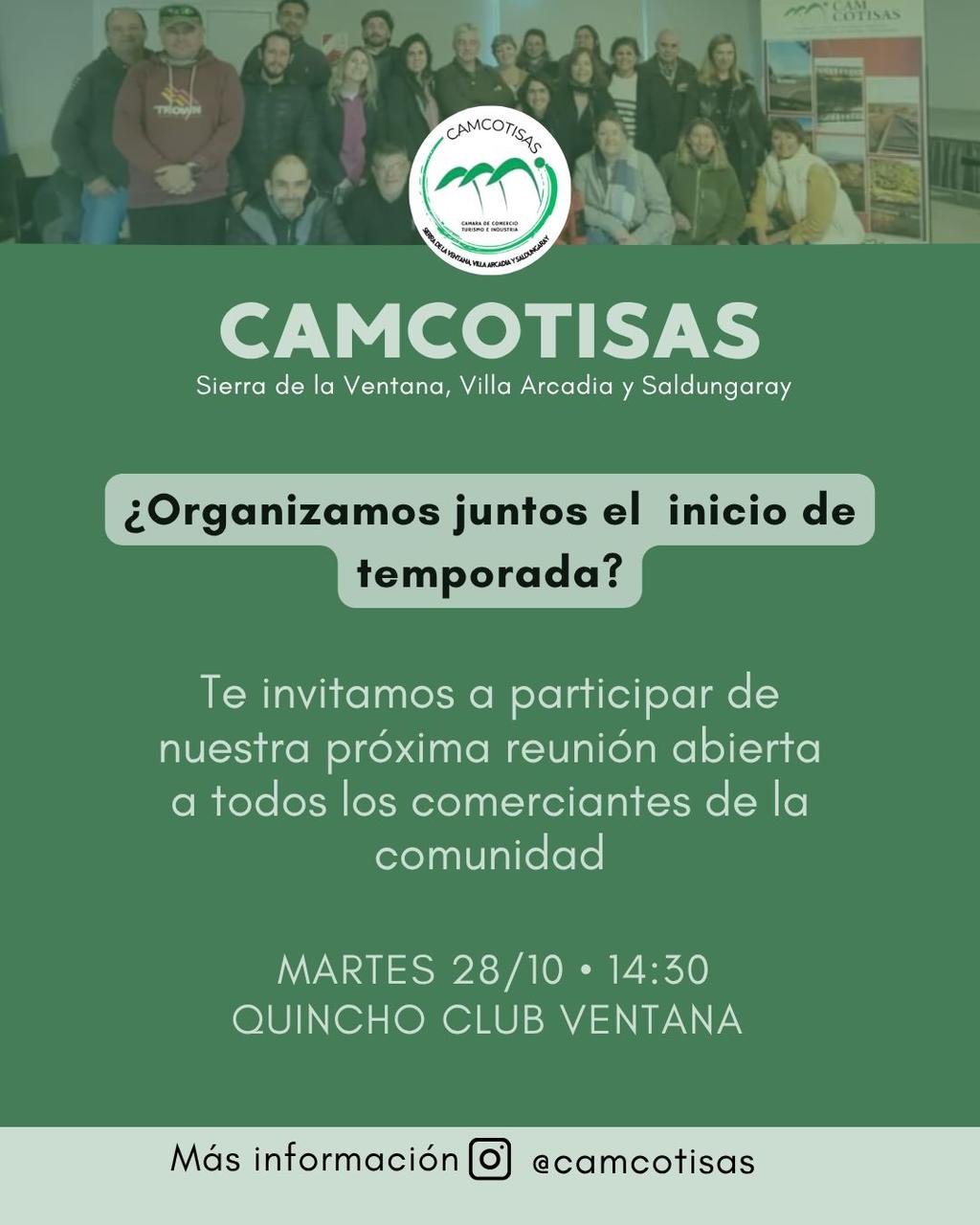 La reunión de CAMCOTISAS se realizará el martes 28 de octubre a las 14:30 horas en el Quincho del Club Ventana. Este llamado busca la participación del sector privado para coordinar acciones, estrategias y propuestas que permitan optimizar la temporada turística en las localidades de Sierra de la Ventana, Villa Arcadia y Saldungaray. Para más información, los interesados pueden consultar el Instagram de la Cámara: @camcotisas.