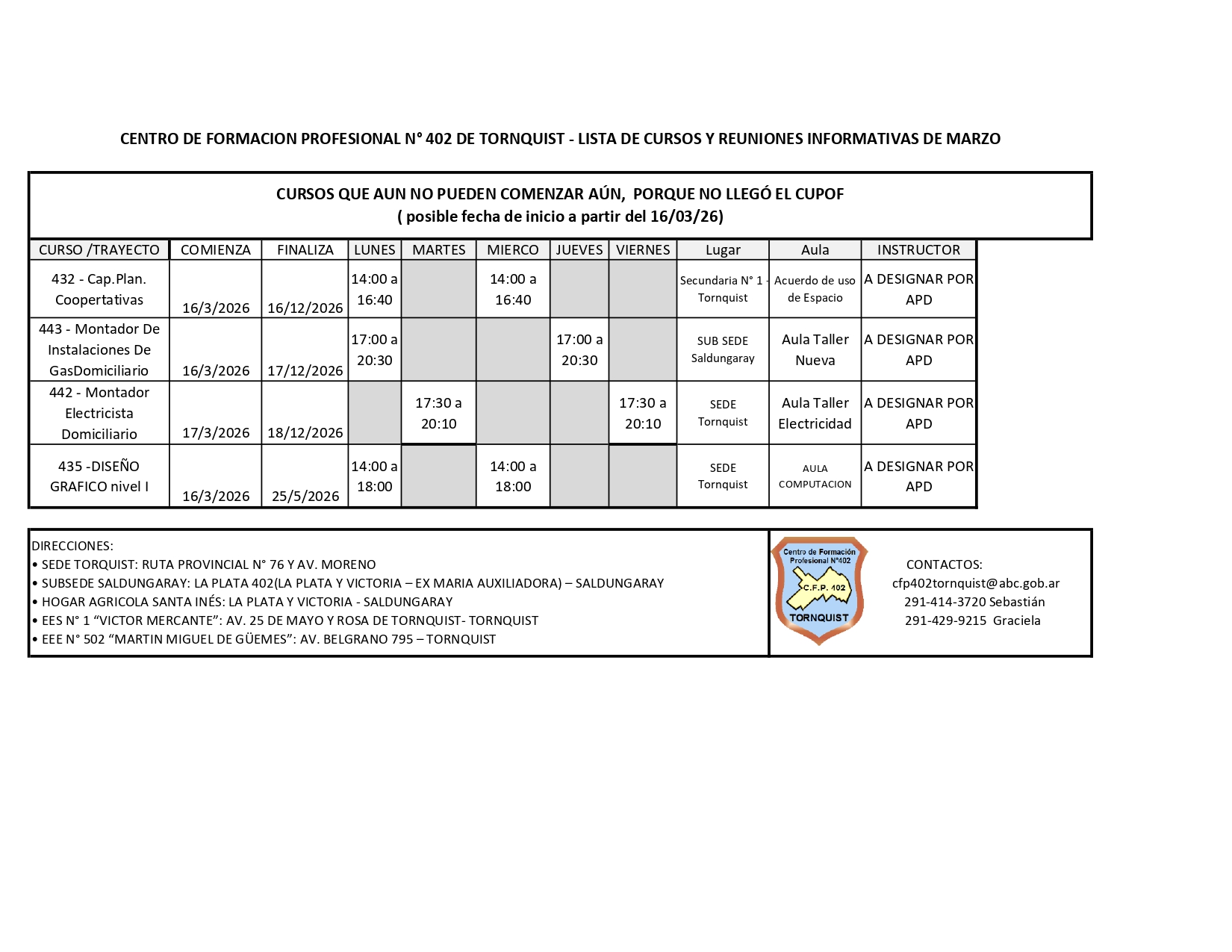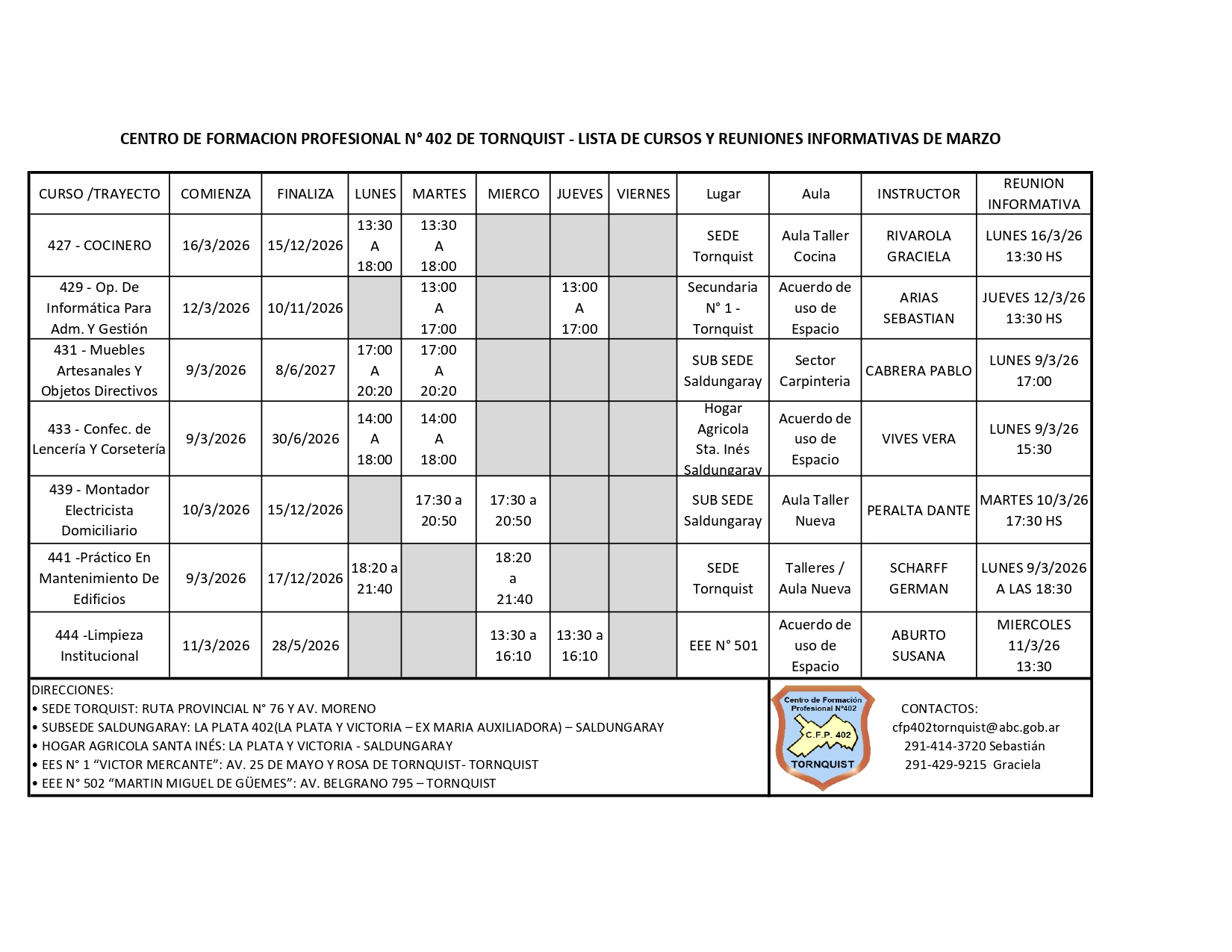 Desde el C.F.P.N.°402 de Tornquist informan que  próximamente darán inicio al ciclo lectivo 2026,po lo cual se publica la lista de cursos y reuniones.