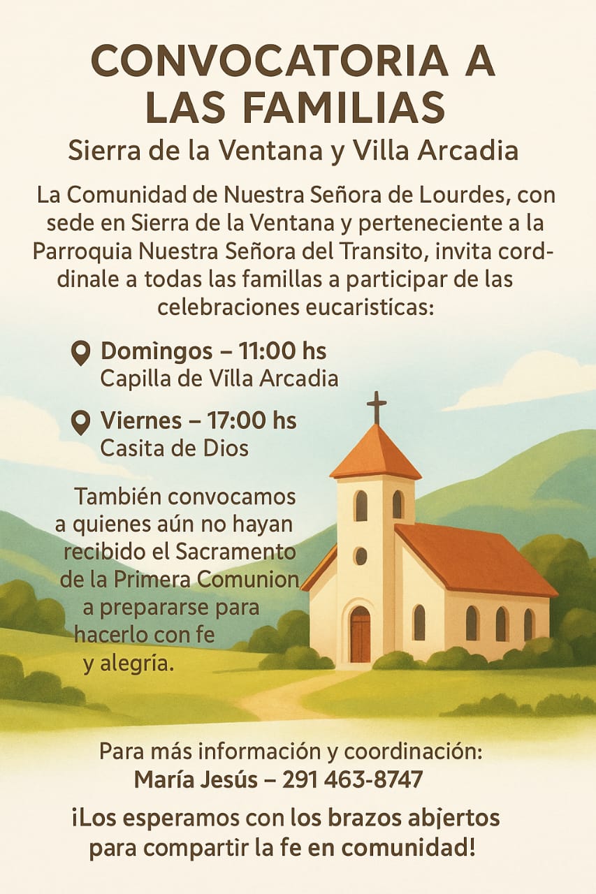 La Comunidad de Nuestra Señora de Lourdes, con sede en Sierra de la Ventana y perteneciente a la Parroquia Nuestra Señora del Tránsito, invita cordialmente a todas las familias a participar de las celebraciones eucarísticas:
