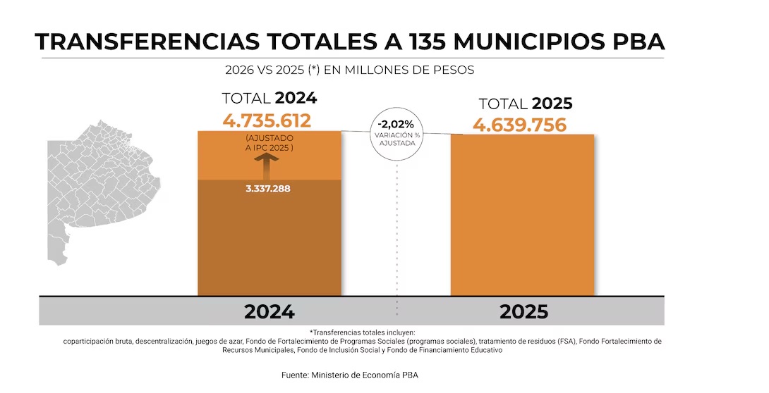 En el mensaje del Presupuesto 2026 que envió Kicillof a la Legislatura justificó la caída en los fondos que envía a los municipios en “la recesión (que) golpea tanto a los recursos provenientes de la coparticipación federal, como a los tributos de origen provincial”. Aseguró que, en conjunto, «los recursos tributarios de la PBA, sin tomar en consideración los recortes sufridos en las transferencias no automáticas, cayeron más de 6% en relación con 2023″. La referencia a este año se debe a que, en 2024 y 2025, el gobernador no logró que la Legislatura le aprobara el Presupuesto anual, y prorrogó de forma consecutiva el de 2023.