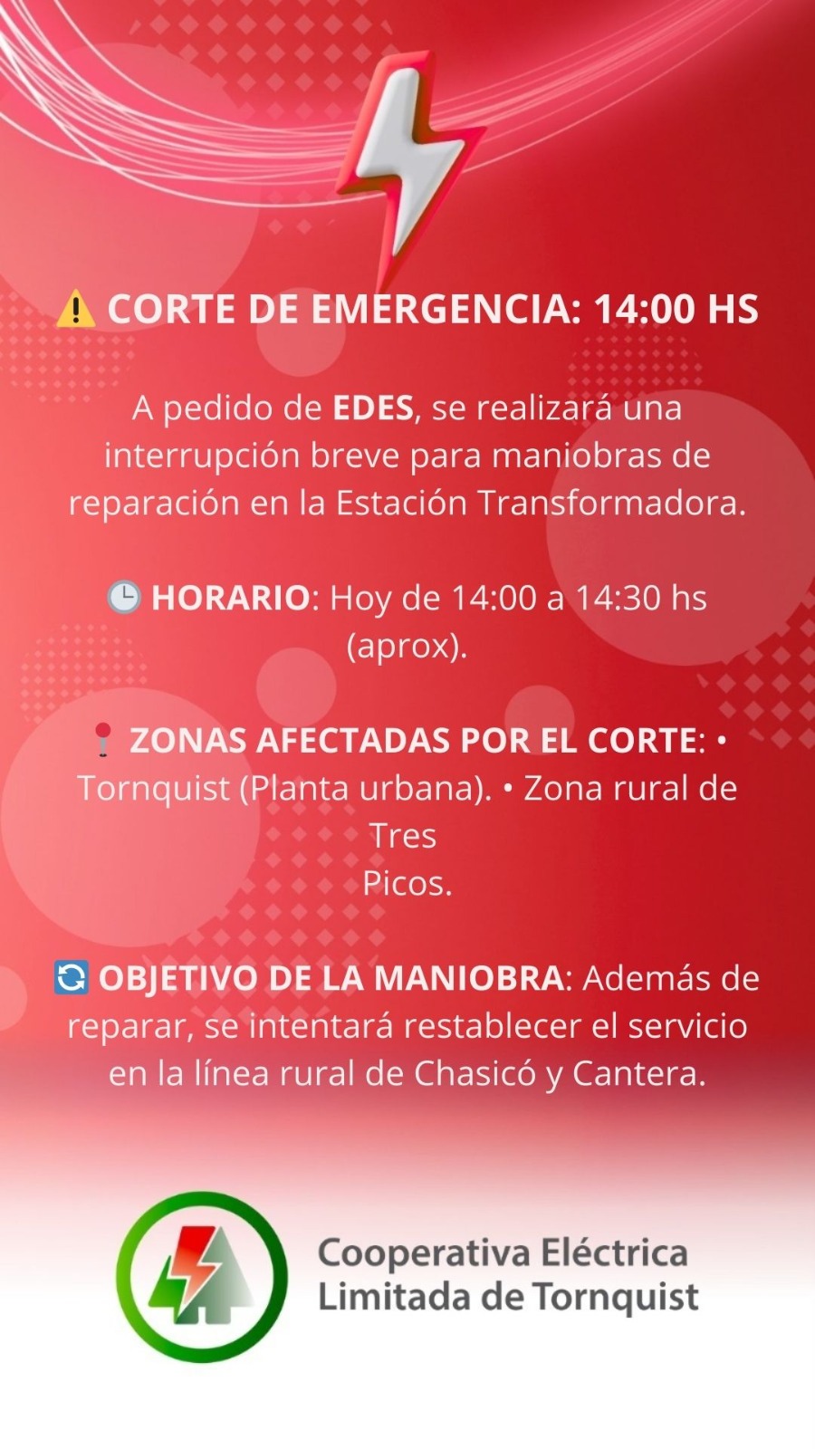 La interrupción del servicio eléctrico tendrá lugar hoy, entre las 14:00 y las 14:30 hs aproximadamente. Afectará a la planta urbana de la localidad y a la zona rural de Tres Picos, con el fin de realizar maniobras técnicas y restablecer el suministro en las líneas de Chasicó y Cantera.