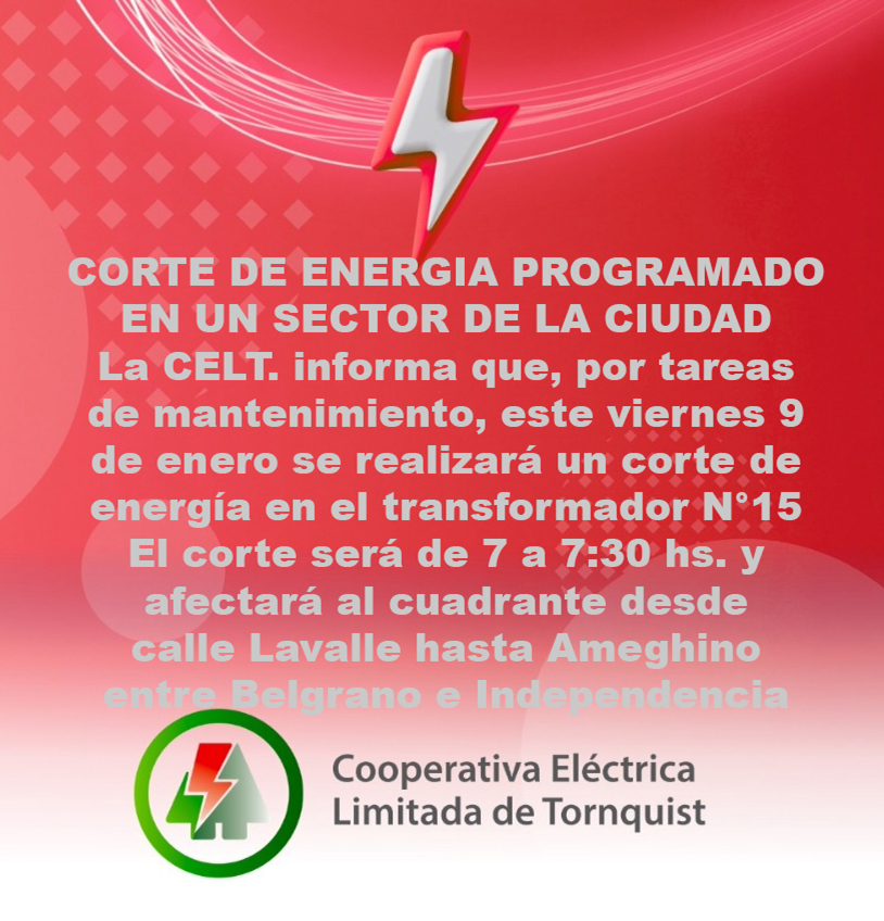 La Cooperativa Eléctrica informó que, debido a tareas de mantenimiento en el transformador N°15, se interrumpirá el servicio este viernes 9 de enero entre las 7:00 y las 7:30 hs. El corte afectará al cuadrante comprendido por las calles Lavalle hasta Ameghino, entre Belgrano e Independencia.