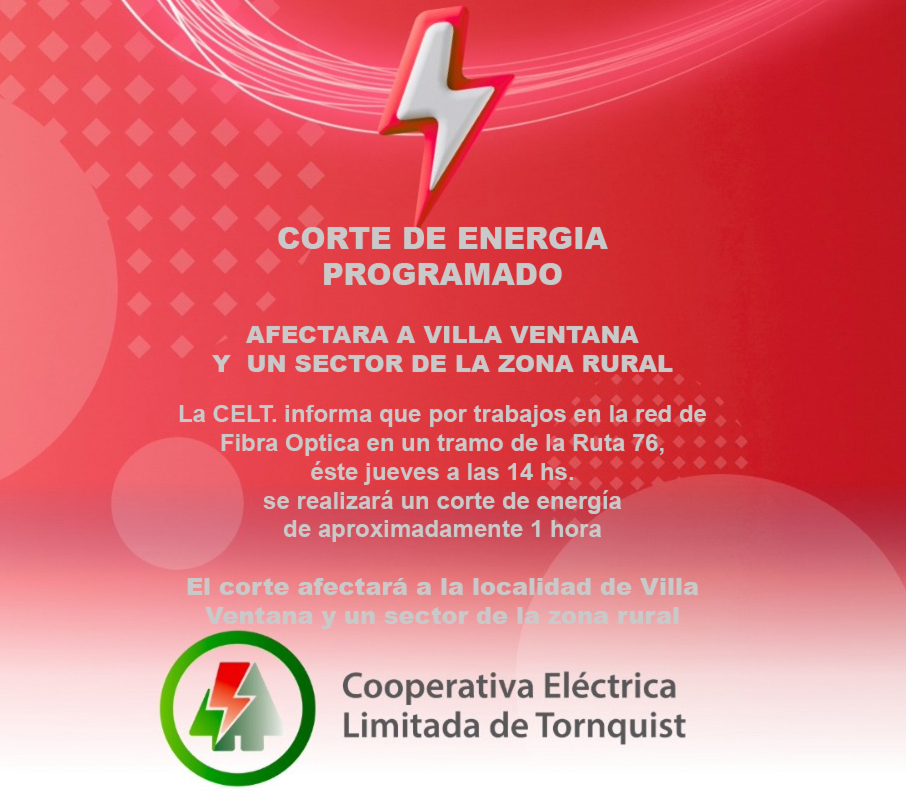 La Cooperativa Eléctrica de Tornquist  informa que este jueves a las 14 horas se realizará un corte de energía de aproximadamente una hora para trabajos en la red de fibra óptica en el sector de la ruta 76.