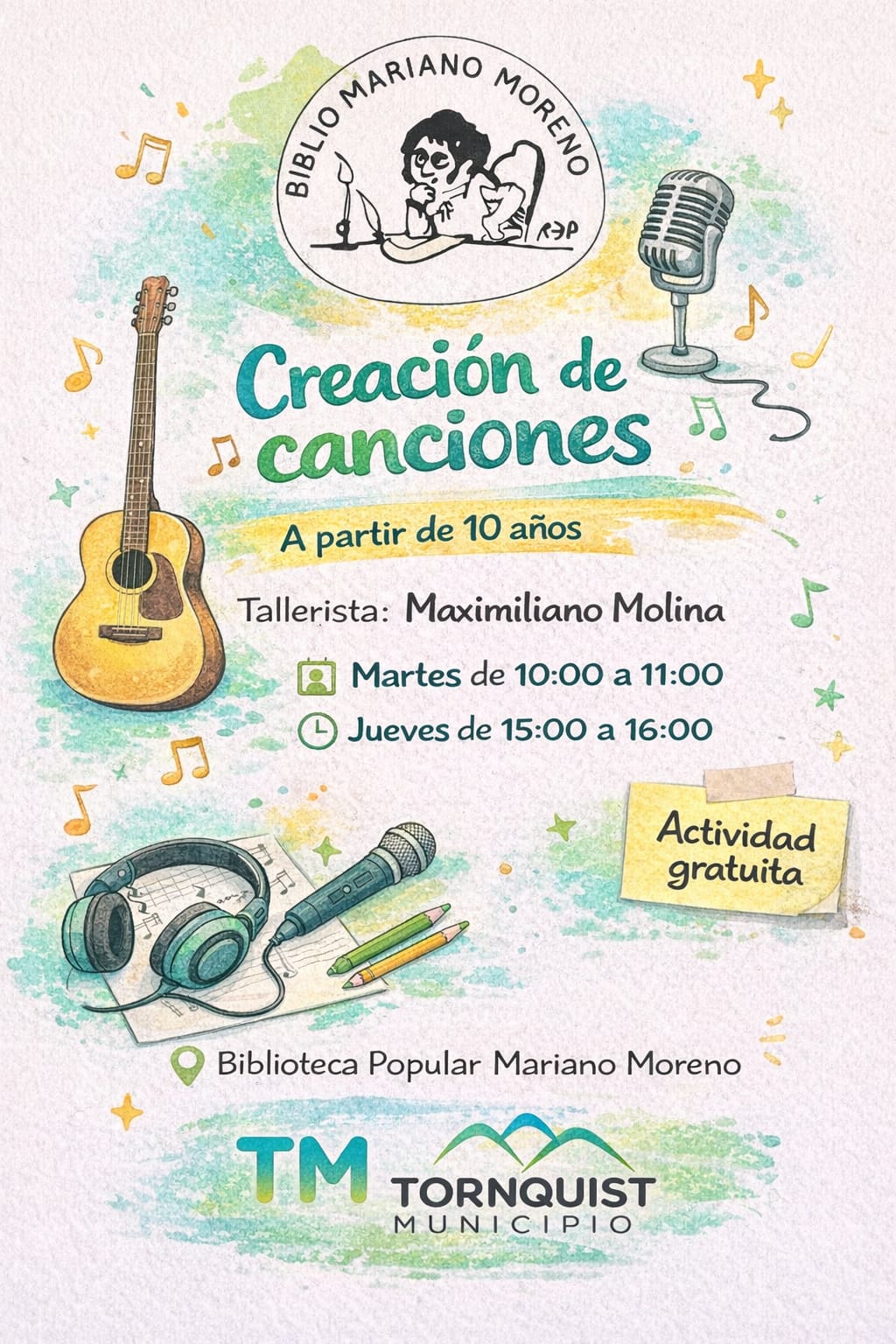 • Creación de Canciones: Un taller innovador para aprender a componer letra y melodía. Se ofrece en dos horarios: martes de 10:00 a 11:00 horas o jueves de 15:00 a 16:00 horas. El tallerista es Maximiliano Molina.