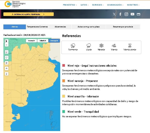 Domingo 26 de abril: Alerta amarillo y posible nieve El domingo el escenario meteorológico cambiará radicalmente. El ingreso de una masa de aire polar pondrá a la provincia de Buenos Aires bajo alerta amarillo. Se prevén condiciones extremas con vientos muy intensos y ráfagas que podrían alcanzar los 90 km/h hacia el mediodía.