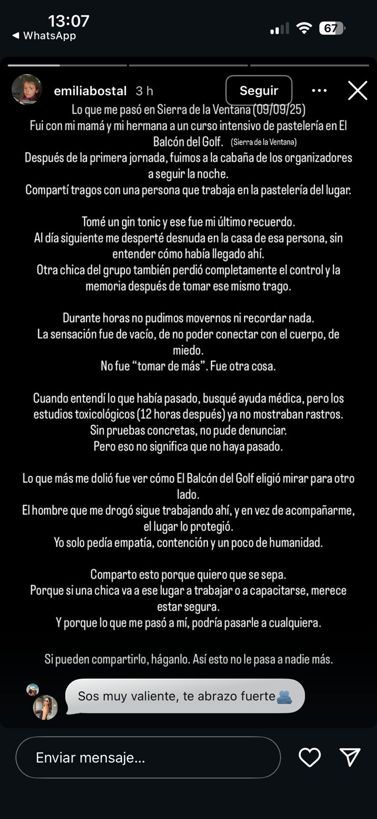 Durante todo el fin de semana estuvo circulando en grupos de WhatsApp un posteo realizado por Emilia Bostal, la cual aseguró que el pasado 9 de septiembre tras un curso de pastelería en Sierra de la Ventana, fue víctima de abuso.