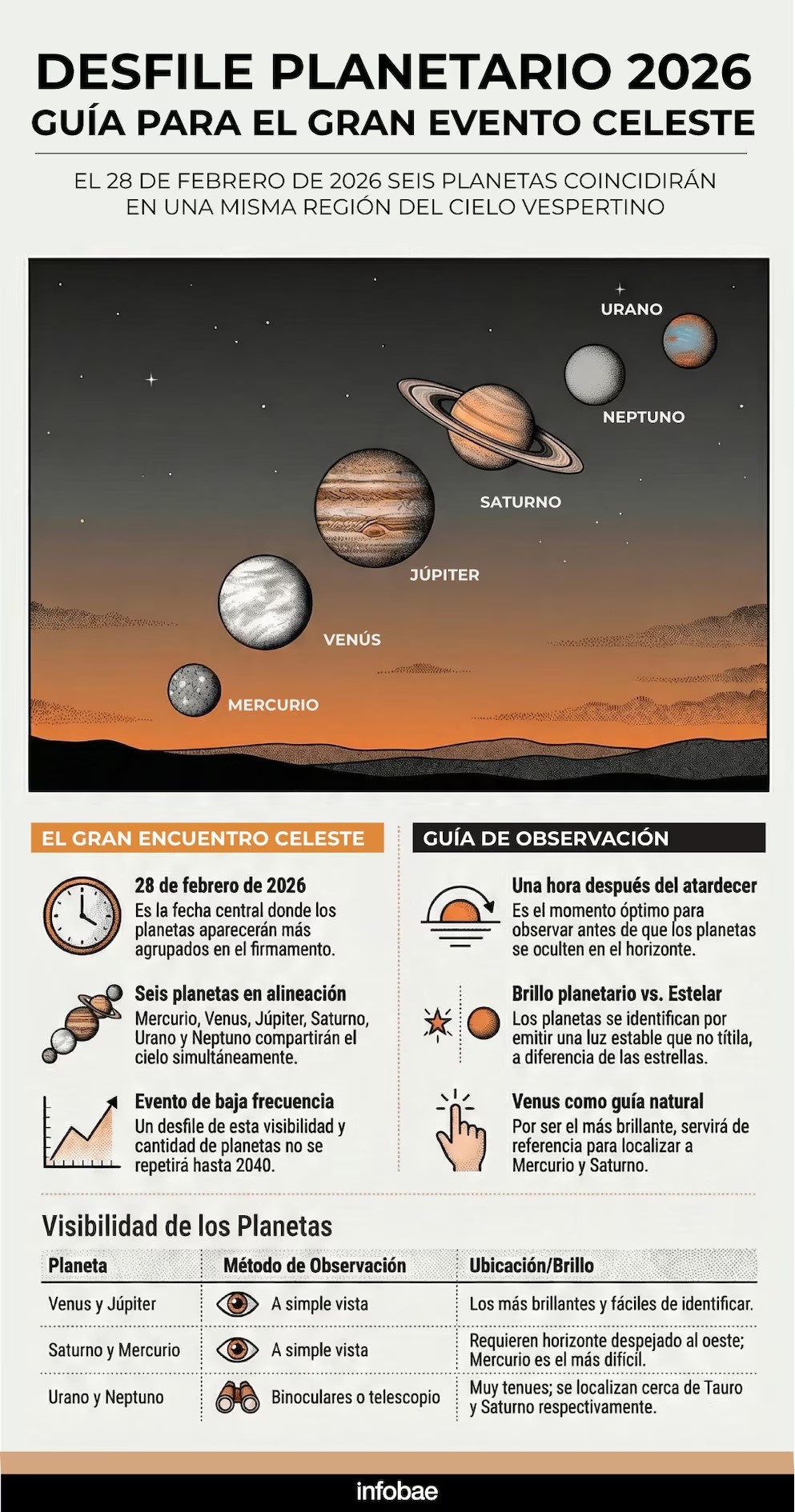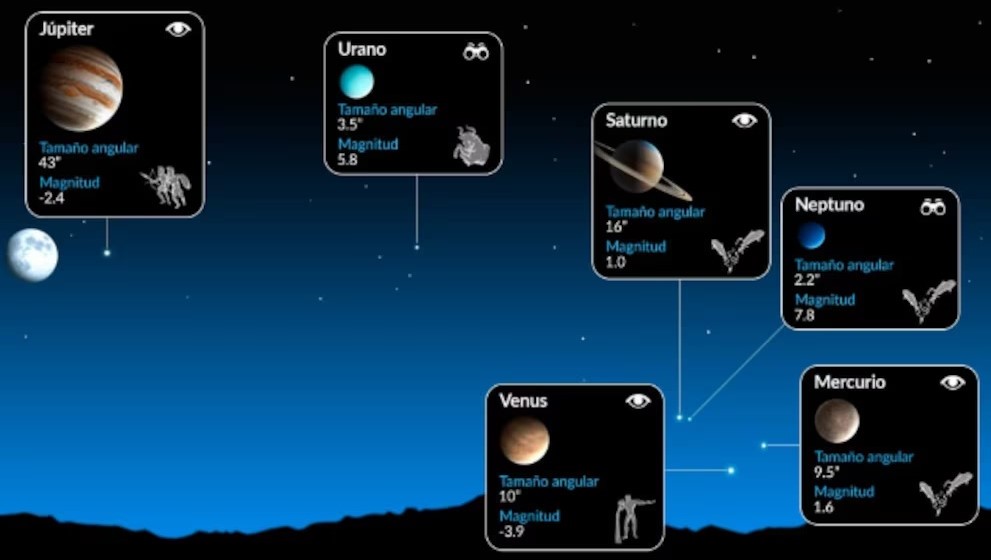 Según los datos astronómicos, cuatro de estos mundos —Mercurio, Venus, Júpiter y Saturno— serán visibles a simple vista si las condiciones climáticas lo permiten. En tanto, para localizar a Urano y Neptuno en la misma región del cielo, será necesario contar con binoculares o telescopios debido a su bajo brillo.