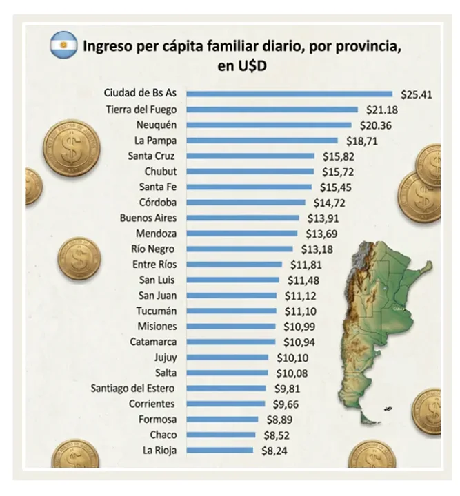 De esta manera, a nivel diario, el ingreso en CABA es de US$25,41, en Tierra del Fuego y Neuquén alcanza US$21,18 y US$20,36 respectivamente. Mientras que en La Rioja se vive con apenas US$8,24 diarios, en Chaco con US$8,52 y en Formosa con US$8,89.