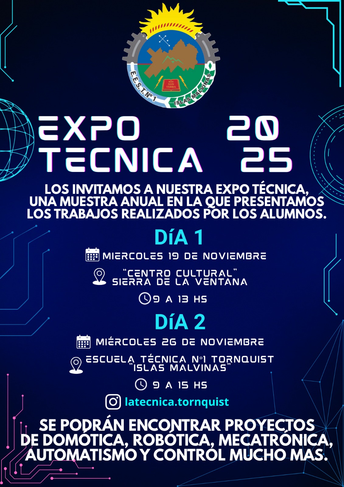 El evento se extenderá a lo largo de dos días, con una jornada inaugural en el Centro Cultural de Sierra de la Ventana el 19 de noviembre, para luego culminar en la sede de la escuela el 26 de noviembre. Los asistentes podrán explorar innovaciones en áreas como Robótica, Domótica, Mecatrónica y Automatismo.