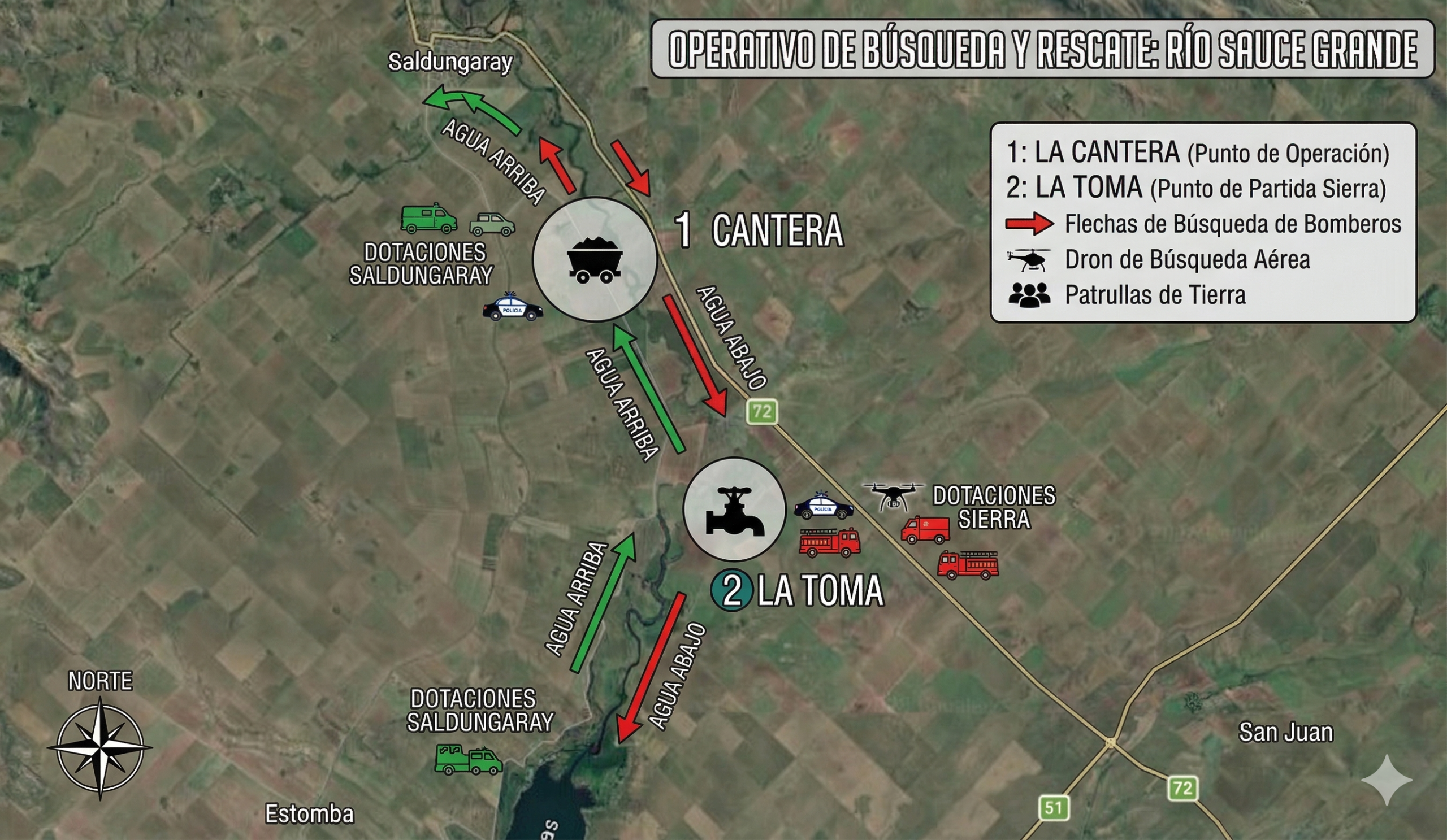 Sector Cantera (Saldungaray): Un segundo grupo se apostó a 10 kilómetros de la localidad. Este equipo se subdividió a su vez en dos células: una con dirección aguas abajo y otra aguas arriba, para asegurar que ningún tramo del cauce quede sin revisar.