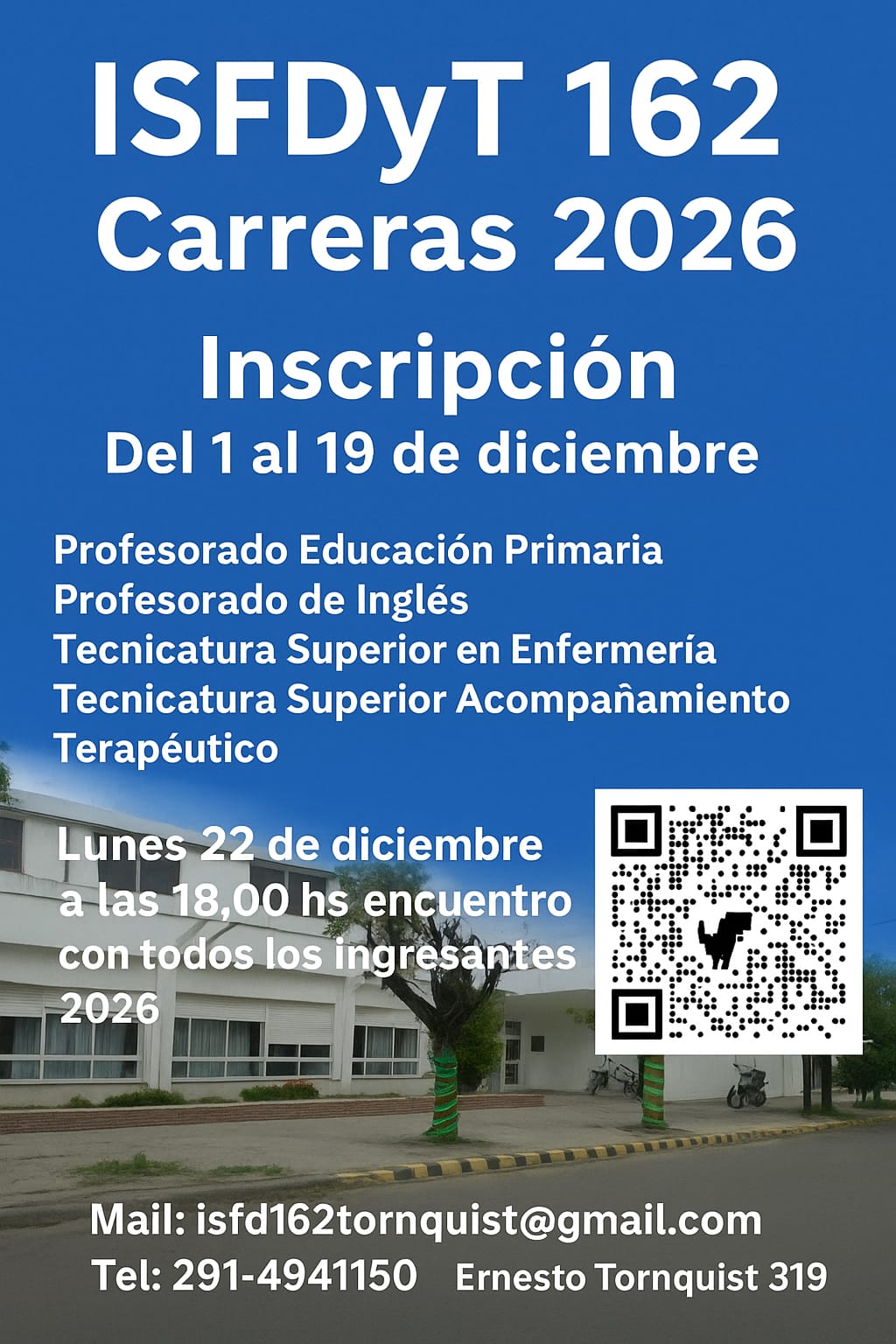 El Instituto Superior de Formación Docente y Técnica (ISFDyT) 162 anuncia que se encuentran abiertas las inscripciones para las carreras que se dictarán durante el próximo año 2026.
