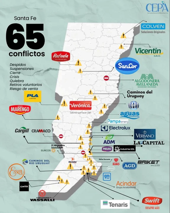 El Centro de Economía Política Argentina (CEPA) publicó, asimismo, un mapa federal que contiene los 629 conflictos laborales y cierres de empresas relevados entre 2024 y 2025 por jurisdicción.
