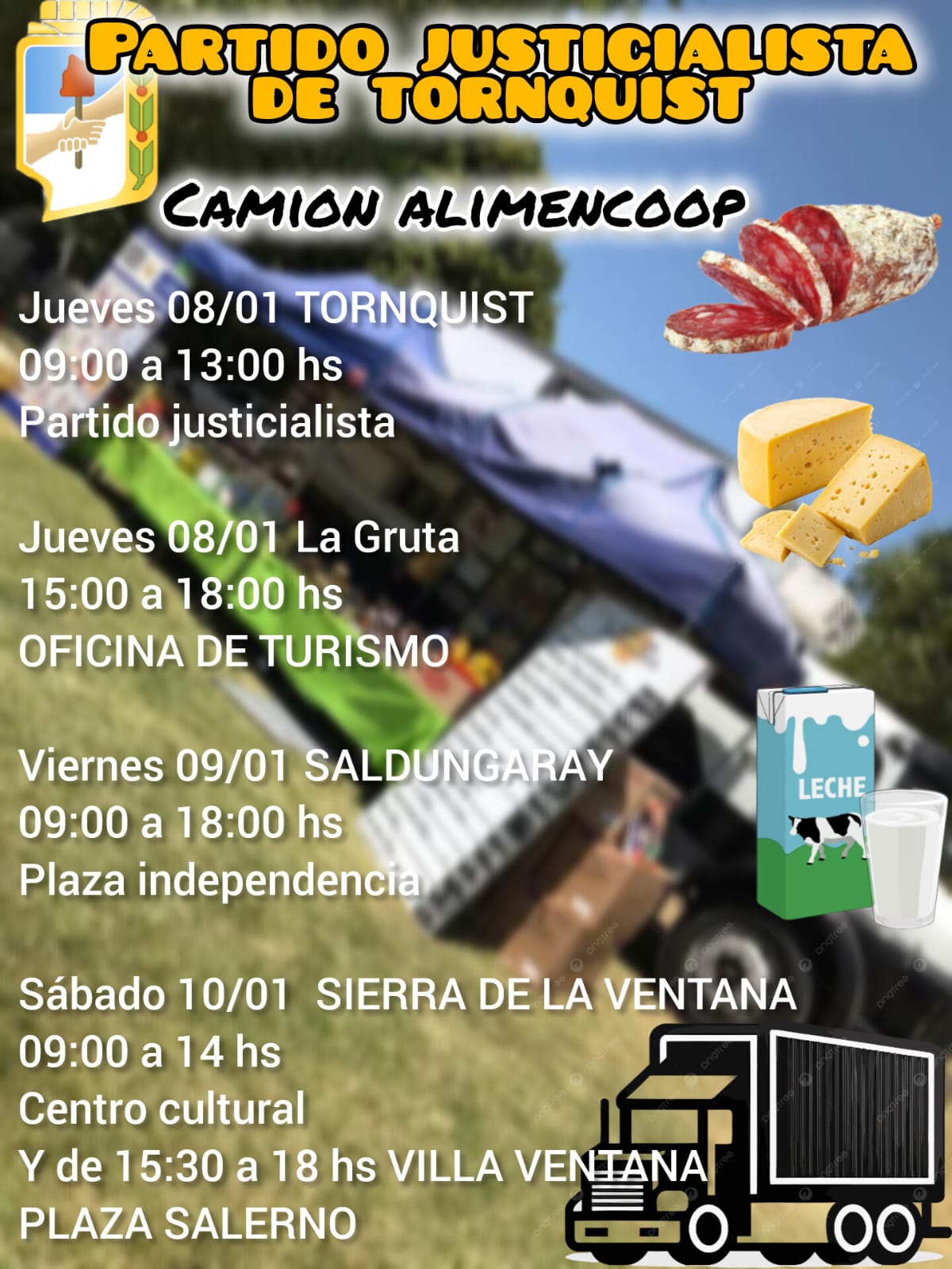 A través de una gestión del Partido Justicialista de Tornquist, el camión de la cooperativa Alimencoop realizará un extenso recorrido por las distintas localidades del distrito entre el jueves 8 y el sábado 10 de enero. La iniciativa busca acercar a los vecinos productos de la canasta básica, como lácteos, quesos y embutidos, a precios cooperativos.