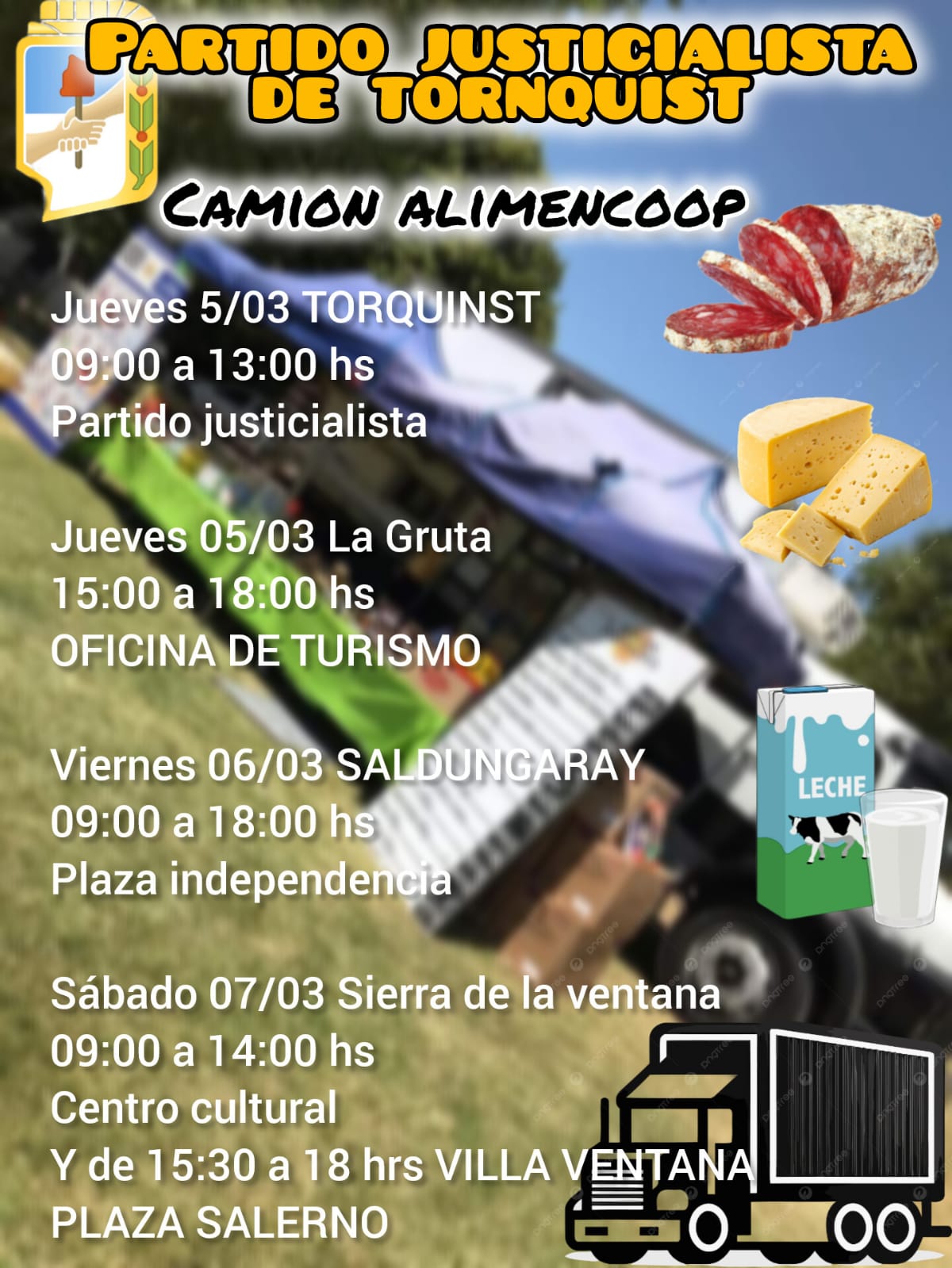 El Partido Justicialista de Tornquist anuncia la nueva visita del camión de la cooperativa Alimencoop, acercando una vez más productos de la economía popular a los vecinos de las distintas localidades del distrito.