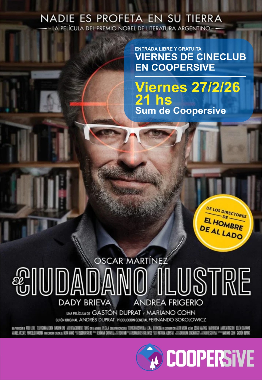 El próximo viernes 27 de febrero, el Cineclub de Coopersive invita a la comunidad a una nueva función con la proyección de la multipremiada película argentina «El Ciudadano Ilustre». La cita tendrá lugar a las 21:00 hs en el SUM de Coopersive, con entrada libre y gratuita.