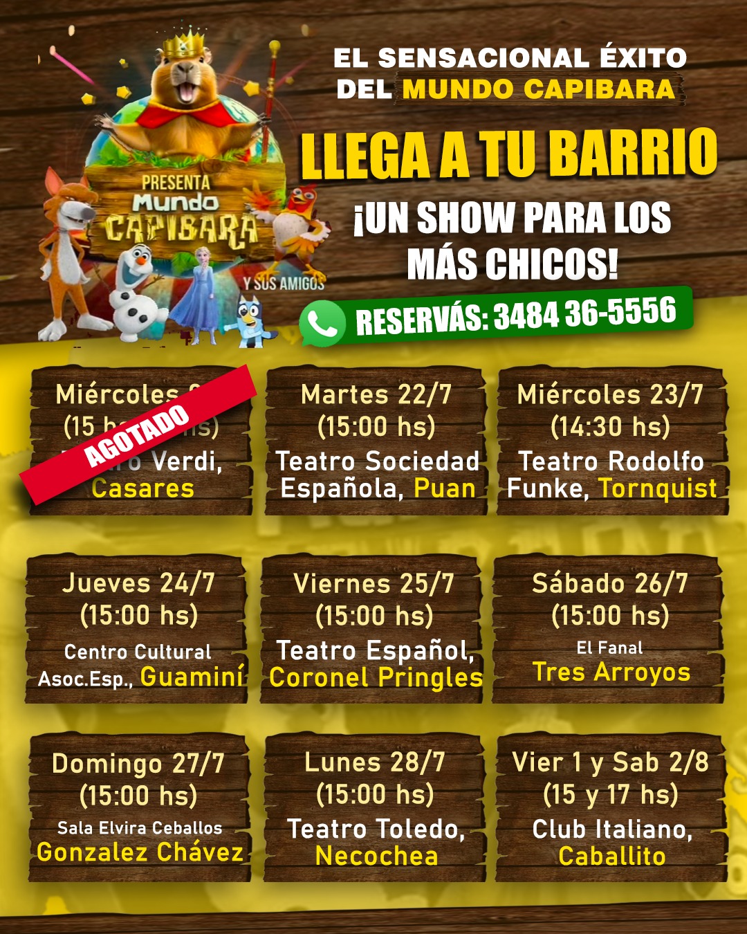 «Capibara es un carpinchito pero de historieta, como un personaje cómico que se presenta en vivo junto con todos sus amigos» presenta Juan Manuel la propuesta para este miércoles 23 de julio. «Es un espectáculo infantil donde se van a encontrar con un montón de personajes; las princesas, Stich, Bartolito, la Vaca Lola, Plim Plim, Spiderman, todos acompañados por el mago, un malabarista y un payaso» desarrolla la actividad teatral que tomará lugar en el Teatro Rodolfo Funke.