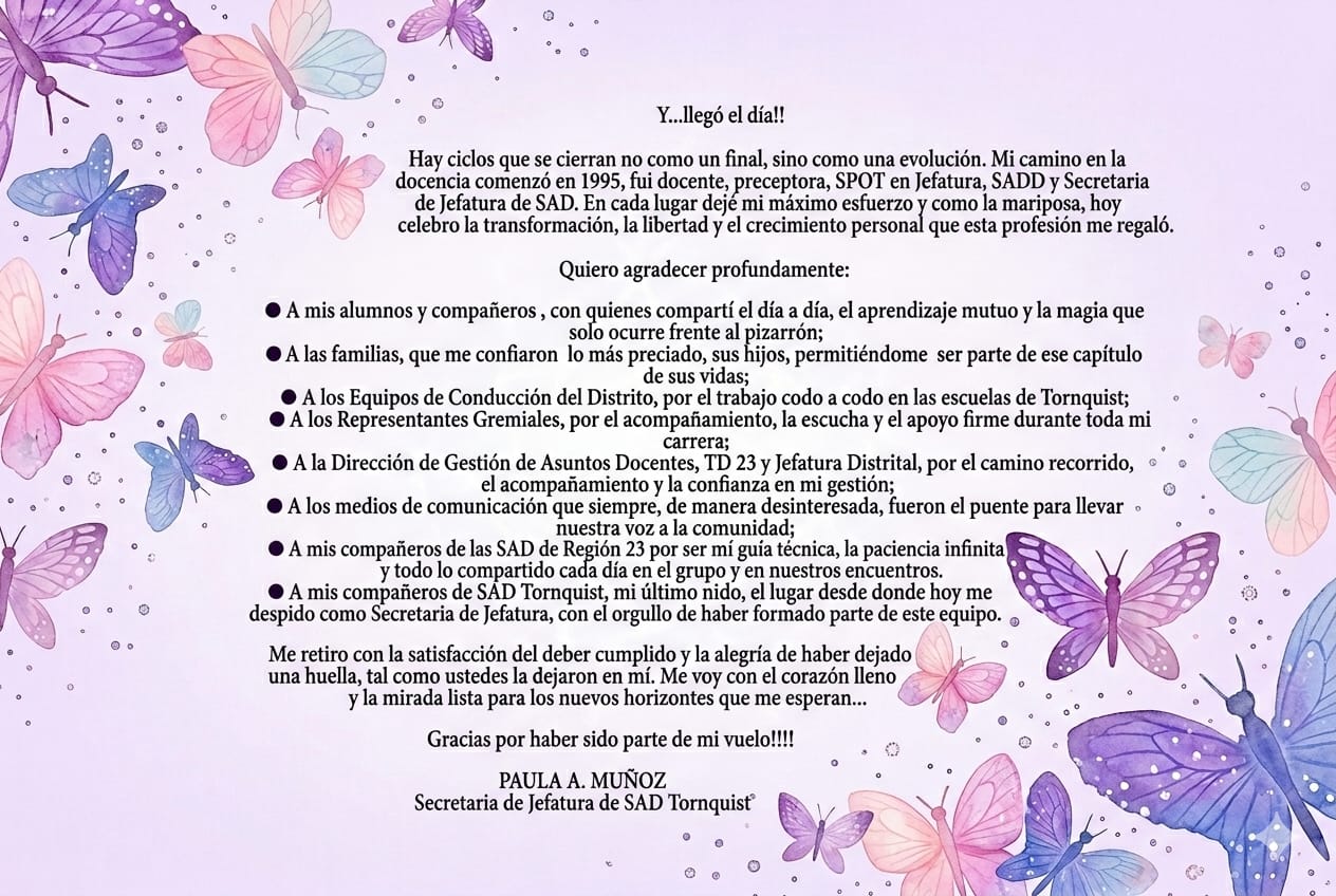 Tras una destacada trayectoria en la docencia que comenzó en 1995, la Secretaria de Jefatura de la Secretaría de Asuntos Docentes (SAD) cierra un ciclo de transformación y crecimiento personal. Con un emotivo mensaje, agradece a alumnos, colegas y a toda la comunidad educativa de Tornquist por los años compartidos, retirándose con la satisfacción del deber cumplido y la mirada puesta en nuevos horizontes.