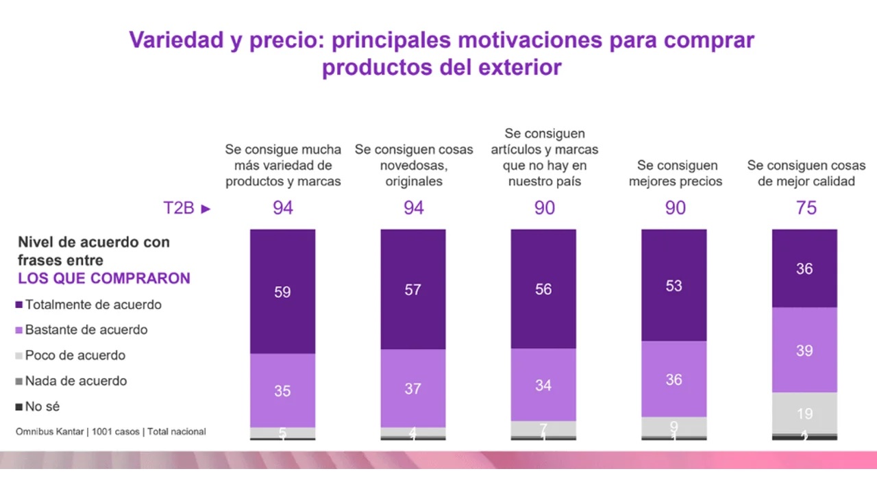 Valeria de Urraza, Business Development, de Kantar agrega: «Comprar productos en el exterior ha sido históricamente uno de los aspiracionales claves del consumo en la clase media, que siempre considera que el mundo ofrece cosas mejores que aquellas a las que accedemos localmente. Y eso hoy sigue vigente y está detrás del boom de la compra en plataformas, más allá de la conveniencia genuina de precio y variedad en muchas categorías».