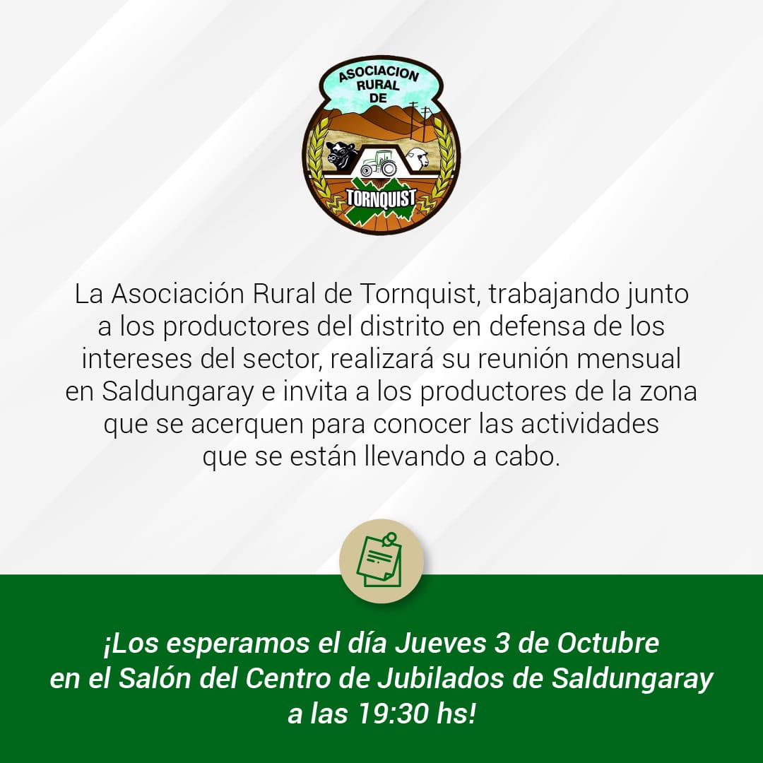 Desde la Asociación Rural de Tornquist informaron que el próximo jueves llevarán adelante su clásica reunión mensual en Saldungaray.