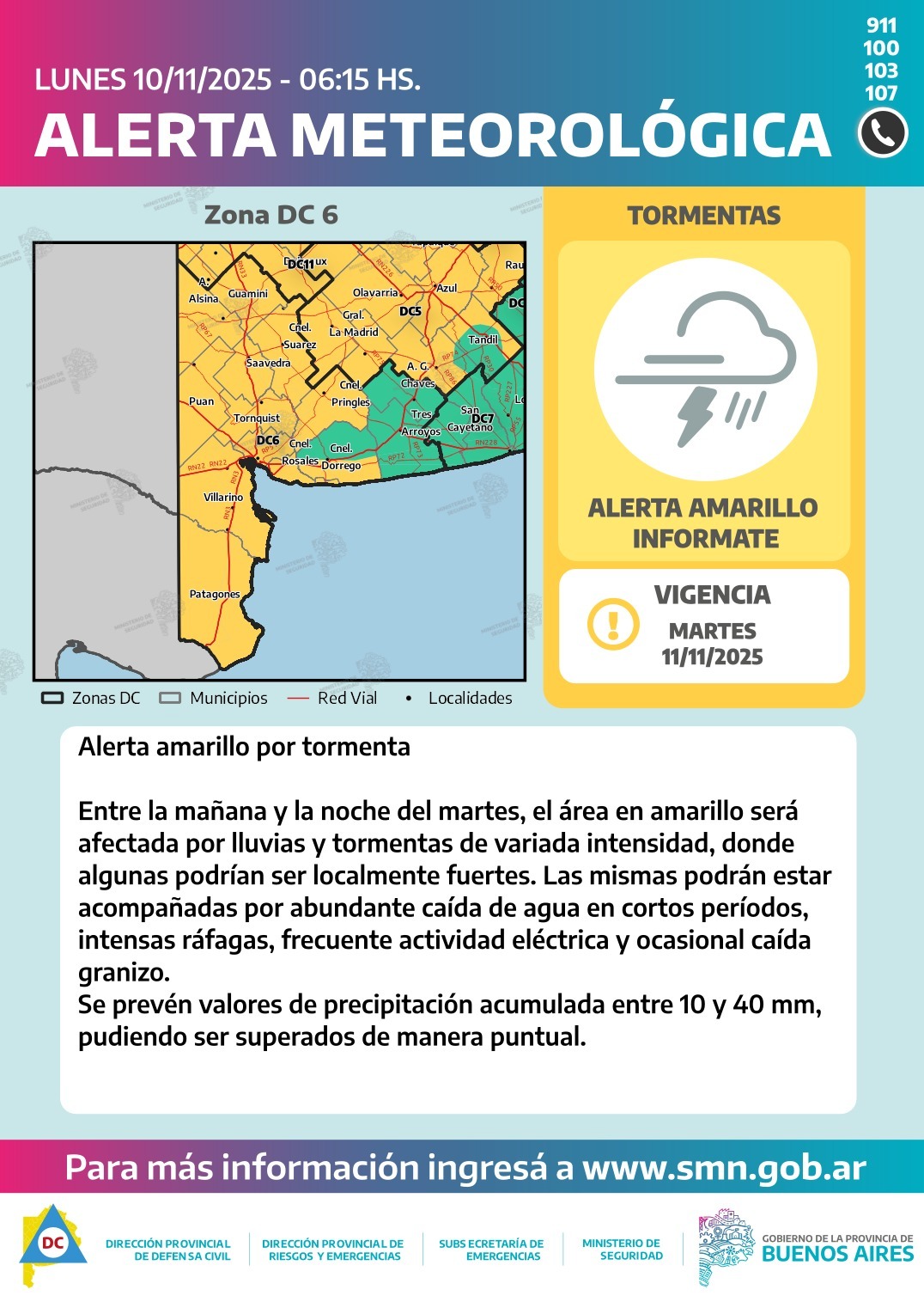 La advertencia rige para hoy, comprendiendo, además de nuestra ciudad, los distritos de Bahía Blanca, Patagones, Villarino, Puan, Adolfo Alsina, Guaminí, Coronel Suárez, Saavedra, Coronel Pringles, Tornquist, Coronel Rosales, Monte Hermoso y Coronel Dorrego. También incluye a gran parte de las provincias de La Pampa y Río Negro.