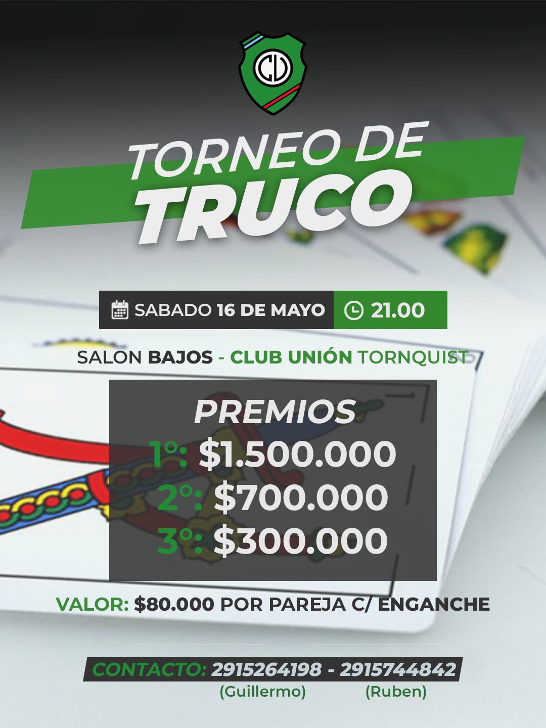 El Torneo de Truco del Club Unión de Tornquist, previsto para el 9 de mayo, fue reprogramado, por cuestiones de agenda, para el sábado 16 de mayo.