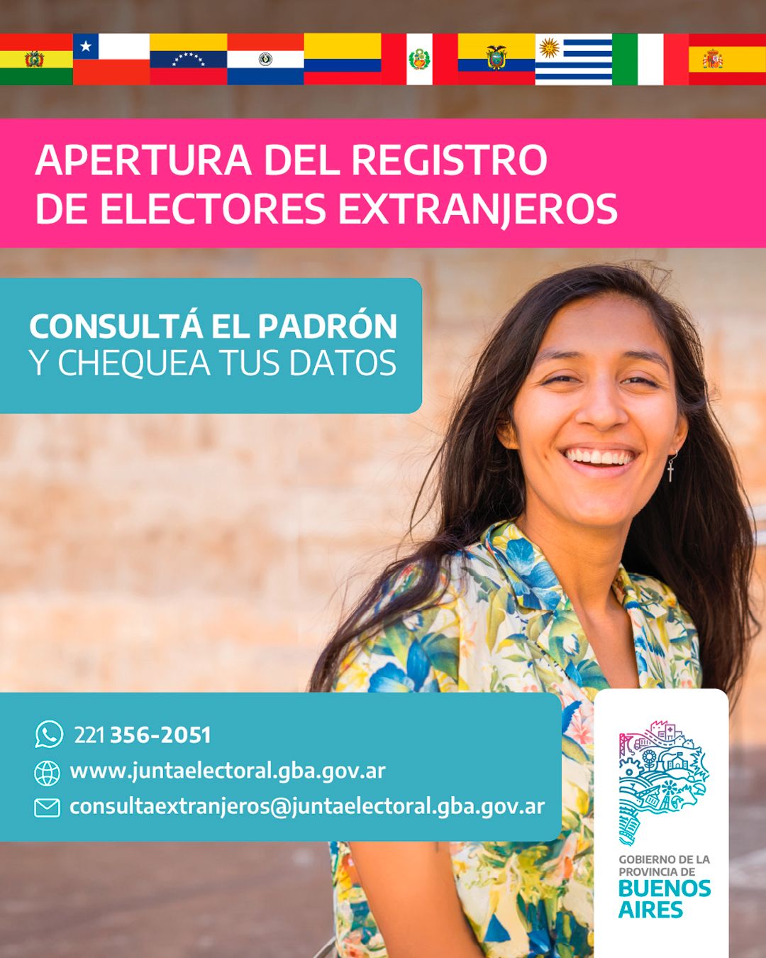 «Desde el 25 de marzo hasta el 1° de diciembre se encuentra abierta la consulta del Registro de Electores Extranjeros/as de la provincia de Buenos Aires. Es el momento clave para que cada ciudadano pueda controlar sus datos y denunciar inscripciones indebidas, garantizando así la transparencia del proceso electoral».