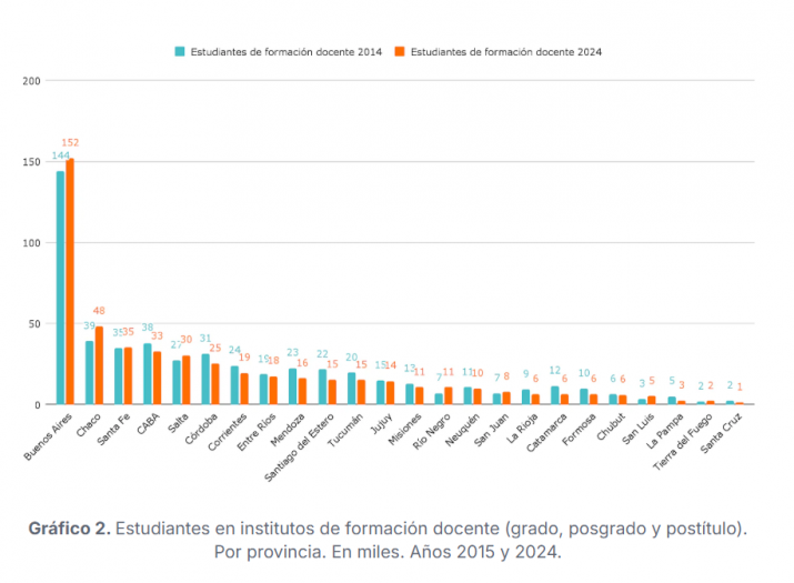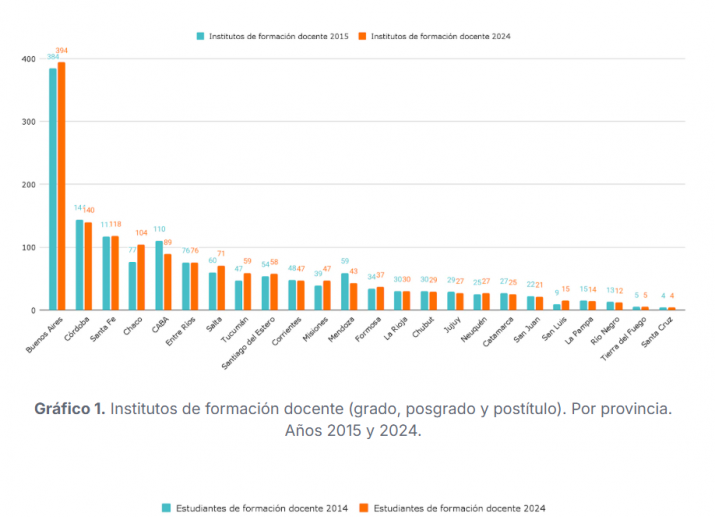 Los datos surgen del informe «Institutos de formación docente«, con autoría de Romina de Luca (Investigadora Adjunta del CONICET y Coordinadora del Área de Educación del Centro de Estudios e Investigación en Ciencias Sociales-CEICS), María Sol Alzú y Leyre Sáenz Guillén (Argentinos por la Educación). A partir del Relevamiento Anual de la Secretaría de Educación nacional, el documento analiza la evolución del número de institutos de formación docente por provincia, los cambios en la matrícula y el crecimiento de los egresados, entre otras variables. Si bien hay carreras de formación docente que se dictan en universidades, el informe pone el foco en los institutos, que concentran la mayor parte de la oferta.