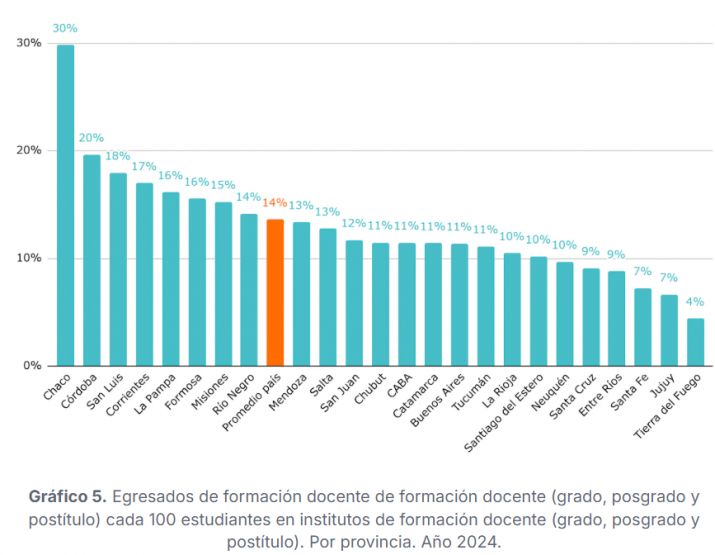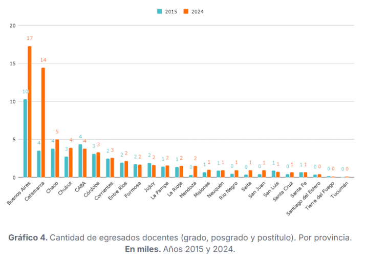 Las provincias donde más creció la cantidad de egresados de los institutos de formación docente en los últimos 10 años son Buenos Aires (+347%), Catamarca (+310%) y Chaco (+175%). En cambio, los egresos cayeron en Tucumán (-18%), Tierra del Fuego (-14%) y Santiago del Estero (-13%).