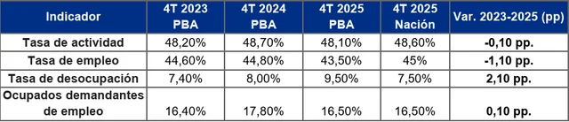 Como primer resultado, en el cuarto trimestre del 2025 la tasa de desocupación subió al 9,5%, quedando por encima de Nación (7,5%) y también por encima del registrado dos años atrás en la provincia (7,4%).