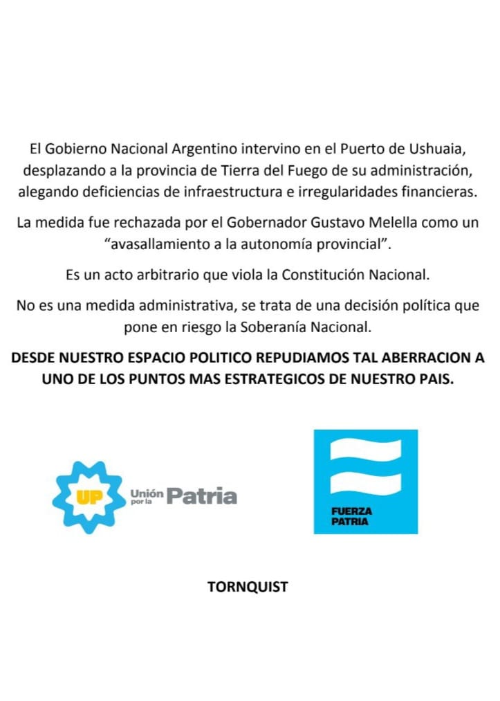 Los bloques de concejales locales de Unión por la Patria y Fuerza Patria emitieron un duro descargo contra el Poder Ejecutivo Nacional tras la intervención del puerto fueguino. Aseguran que la medida, justificada oficialmente por supuestas deficiencias financieras, es en realidad una «decisión política arbitraria» que vulnera los derechos federales de las provincias.