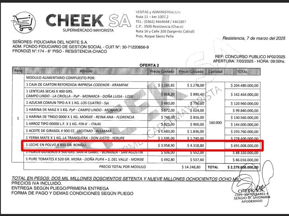 A principios de marzo de 2025, Fiduciaria del Norte S.A., el organismo estatal que administra los fondos provinciales, licitó 480.000 módulos por un total de $7.324.940.800, adjudicando los tres tramos del concurso a la empresa Cheek S.A. Entre los productos entregados, figuraron 128 toneladas de leche en polvo de las marcas “Bongú” y “Purilac”, cuestionadas por no cumplir con los estándares nutricionales y organolépticos exigidos por el Código Alimentario Argentino.