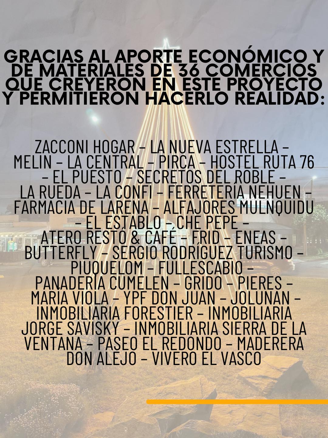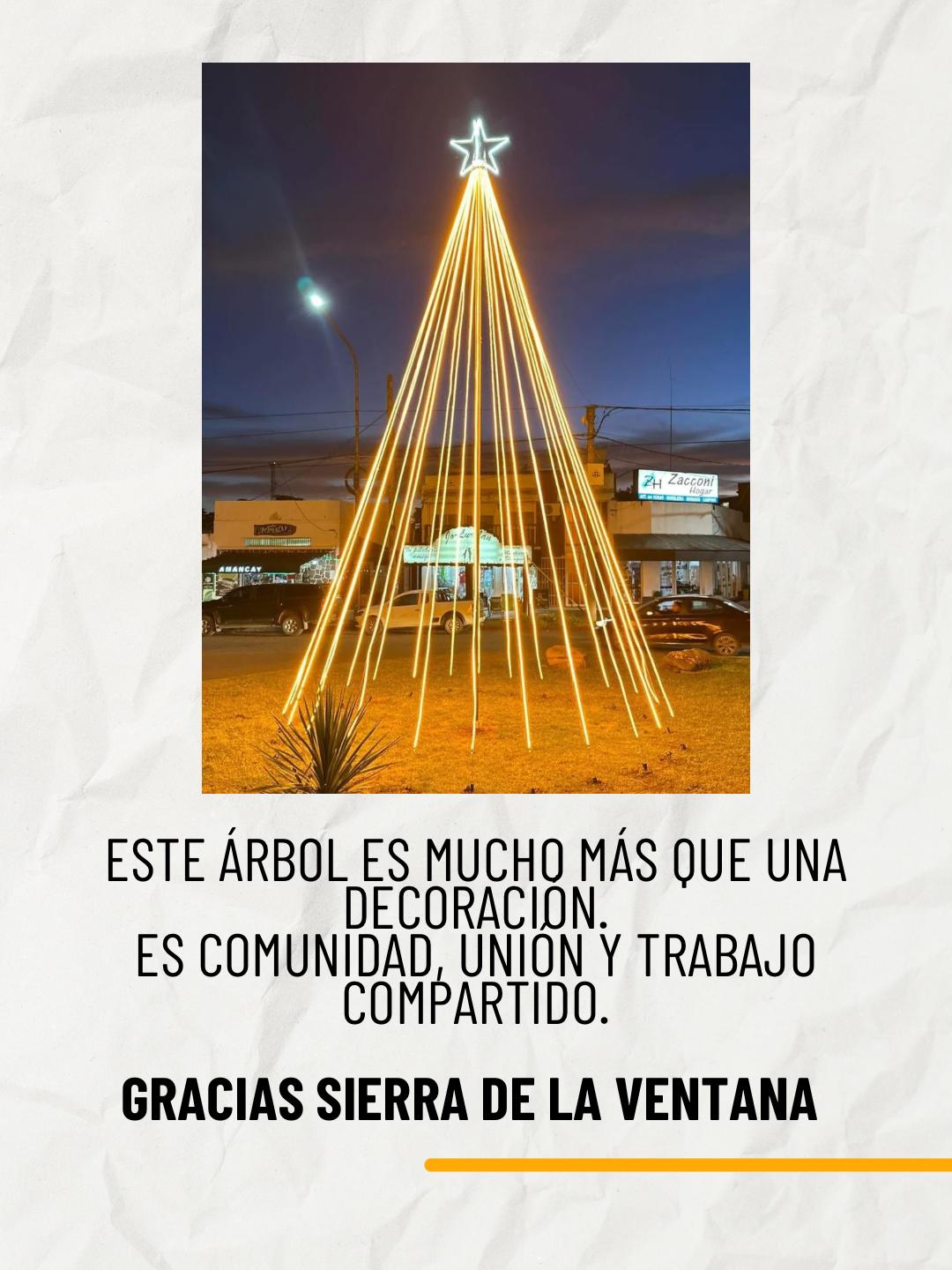 Gracias a los 36 comercios, a cada persona que aportó su trabajo, tiempo y energía, y al acompañamiento institucional, hoy Sierra de la Ventana cuenta con un árbol que nos representará cada Navidad y será punto de encuentro para vecinos y visitantes.