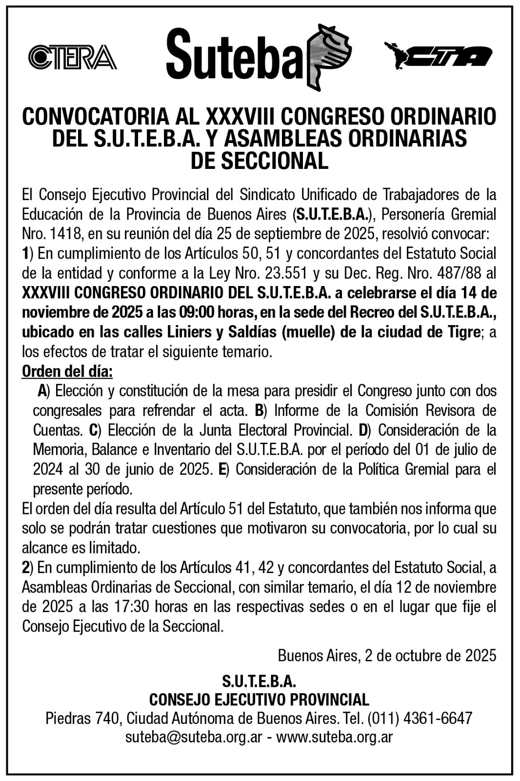 Como todas las instituciones que tienen el acompañamiento gremial, todos los años existe la Asamblea General Ordinaria para proponer una política gremial para el año 2026, además de tratar el balance y el inventario de SUTEBA. «Esto va a ser el 12 de noviembre, en Tornquist y el día 14 de noviembre, viajamos a llevar el mandato que salga de la asamblea local», explica el Secretario gremial de SUTEBA Tornquist, profesor Fernando Caffieri. «Puede participar cualquier afiliado a SUTEBA».