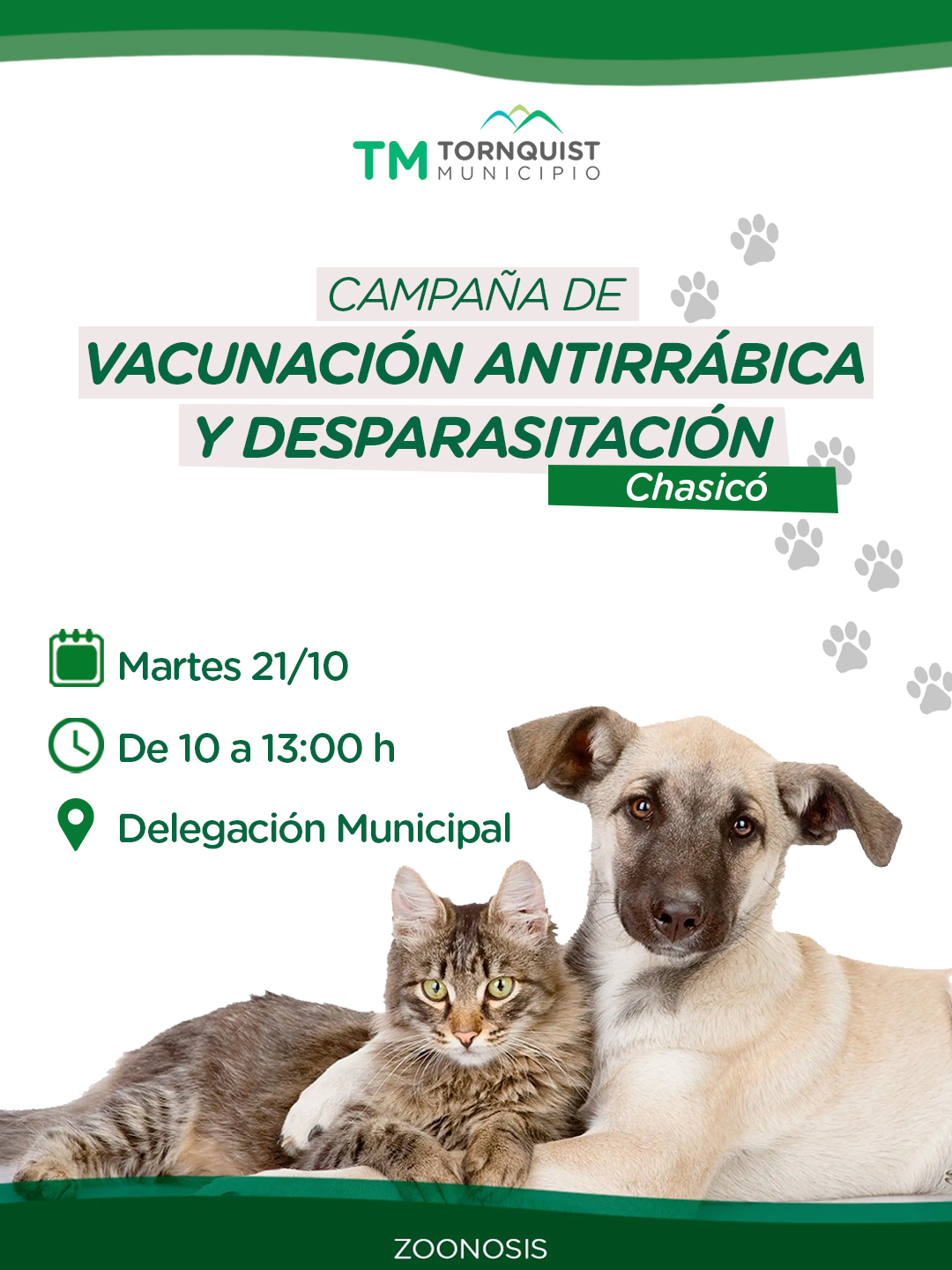 La Subsecretaría de Bromatología y Zoonosis de Tornquist brindará vacunas antirrábicas y desparasitarios de manera gratuita en Chasicó, el próximo martes 21 de octubre.