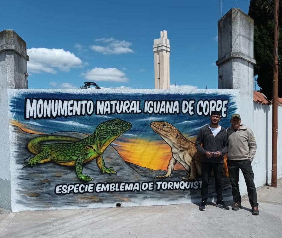 El guardaparque a cargo del monumento natural “iguana de cobre”, Aníbal Arecco, celebró la concreción de un mural en la Avenida 9 de Julio de Tornquist que busca visibilizar y conmemorar a esta especie endémica de la Comarca Serrana. El proyecto, que Aníbal impulsaba desde hace años, se concretó gracias al artista local Manuel Abarzua (@manuelaerografía), quien trabajó con aerógrafos y usó materiales reciclados para pintar la obra.